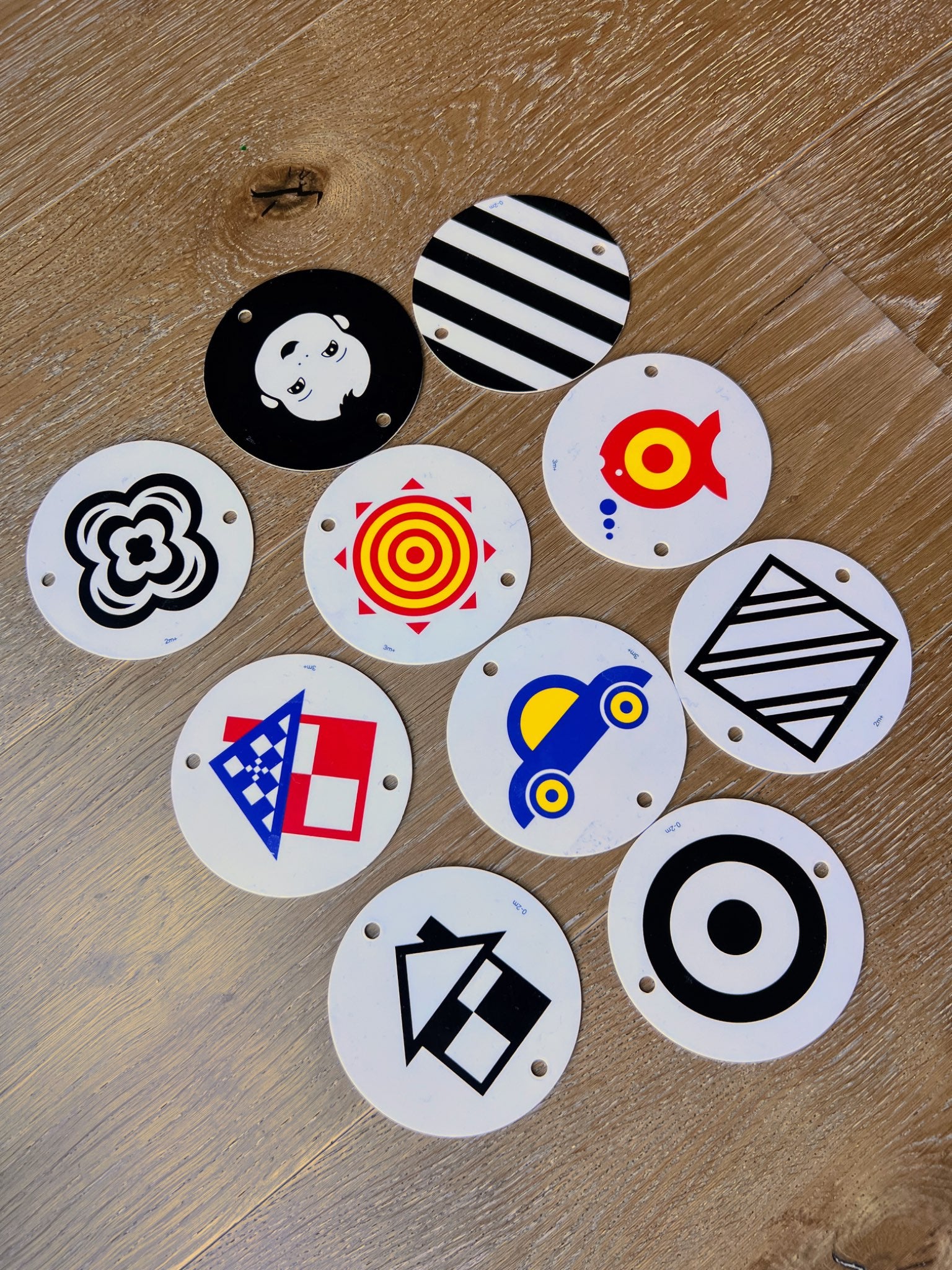 Description : The Wimmer-Ferguson Infant Stim-Mobile introduces baby to high contrast images and colors for early visual and multi-sensory development. Included are ten interchangeable graphic cards which can also be used separately for additional visual development. The adjustable cord is frayed in one place (picture included). Easy to use and install on the crib. All parts included, no box.