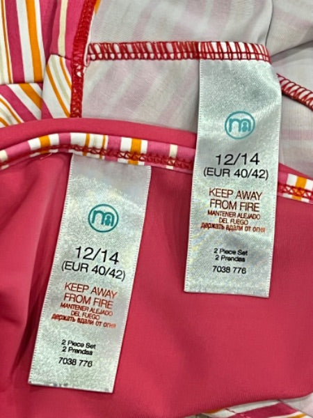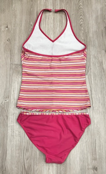 Description : 2-piece Tankini Swimsuit from MotherCare Maternity in the UK. Top - pink/orange/white striped Bottoms- pink with striped edging Size 8-10 US (12-14 UK/40-42 Eu)