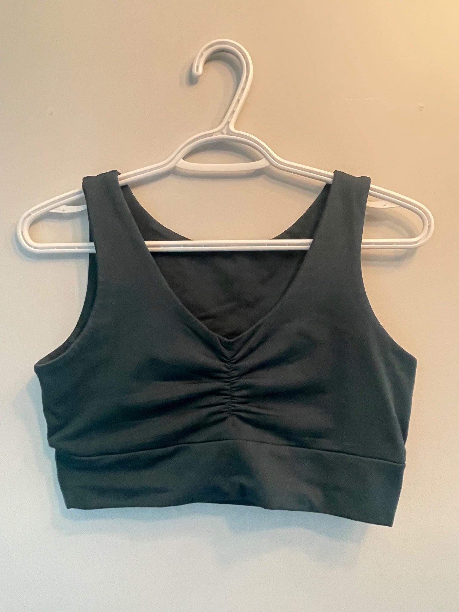 Reversible - wear with a low neckline (nursing friendly), or flip around for some extra coverage (no more falling out in downward dogs!)