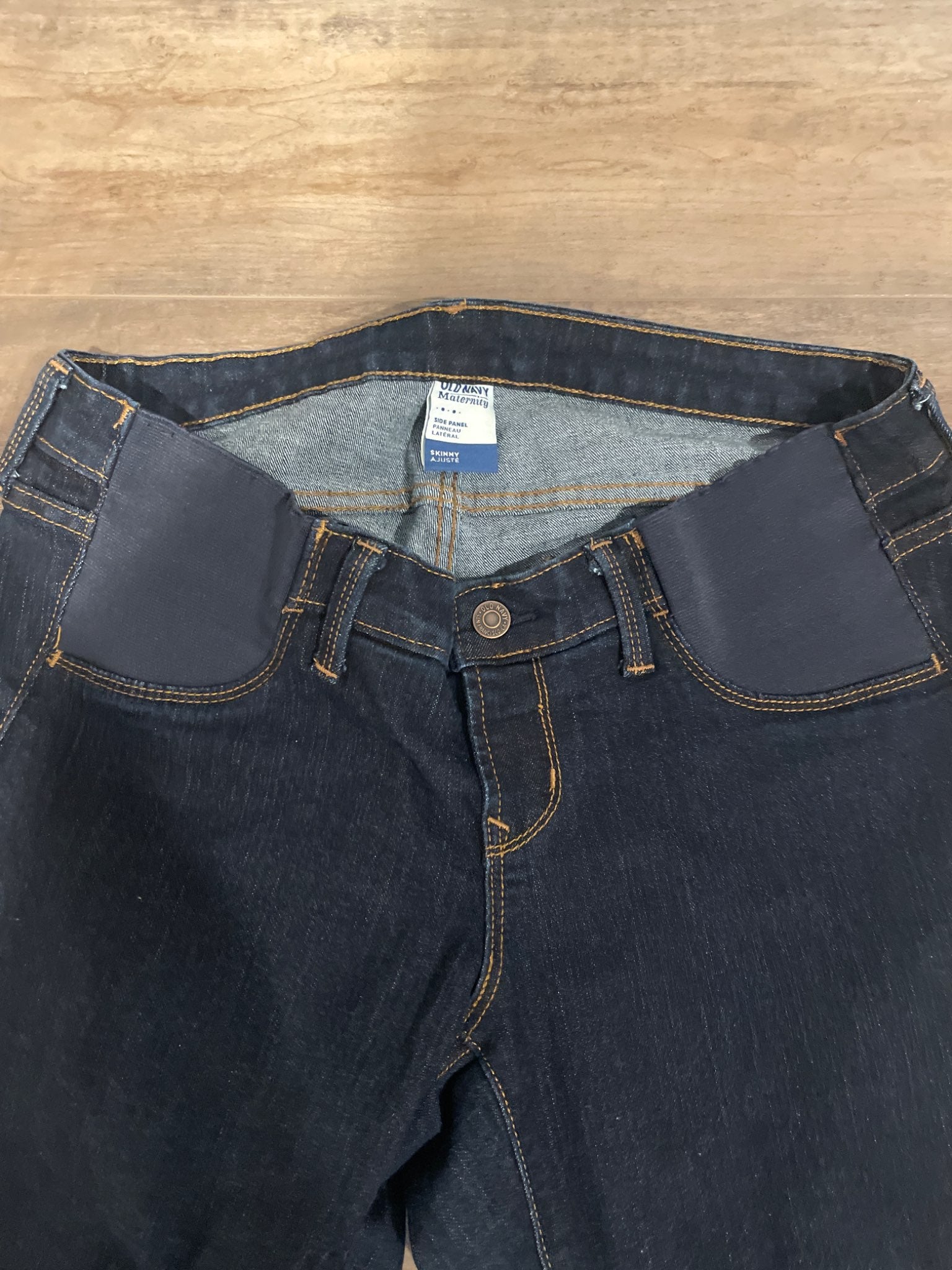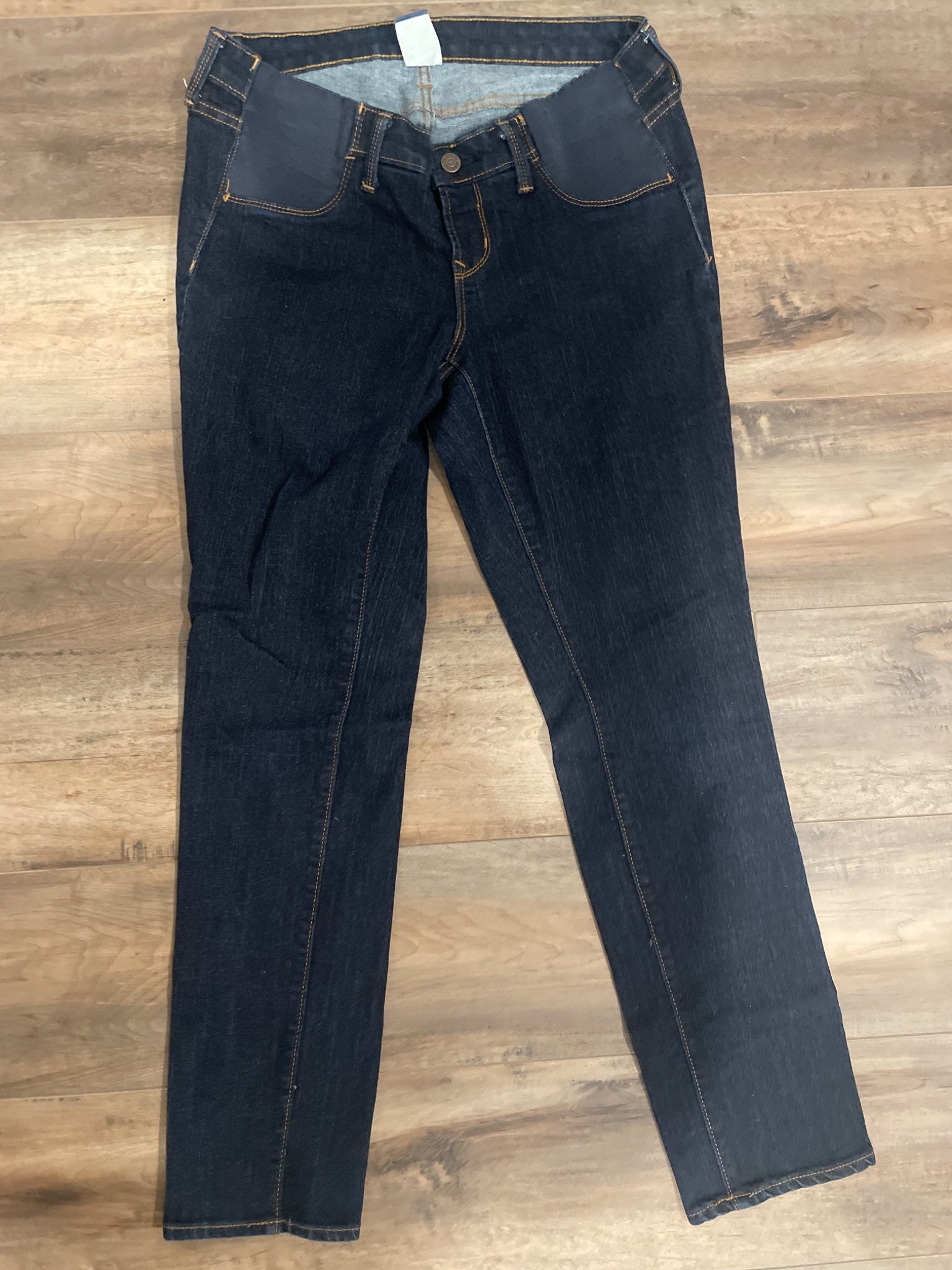 Description : EUC skinny maternity jeans with side panel size 10 regular. Dark wash.