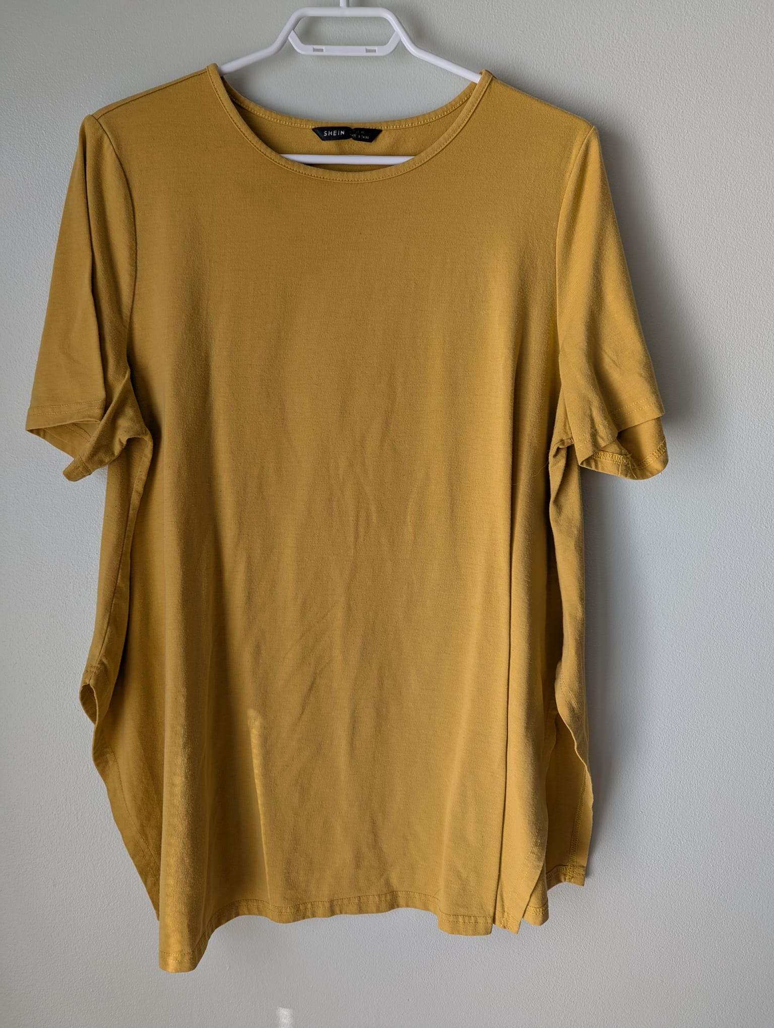 -Shein Solid Mustard Yellow Tee — classic short-sleeve crew neck, made with stretchy fabric for comfort. Size: XXL