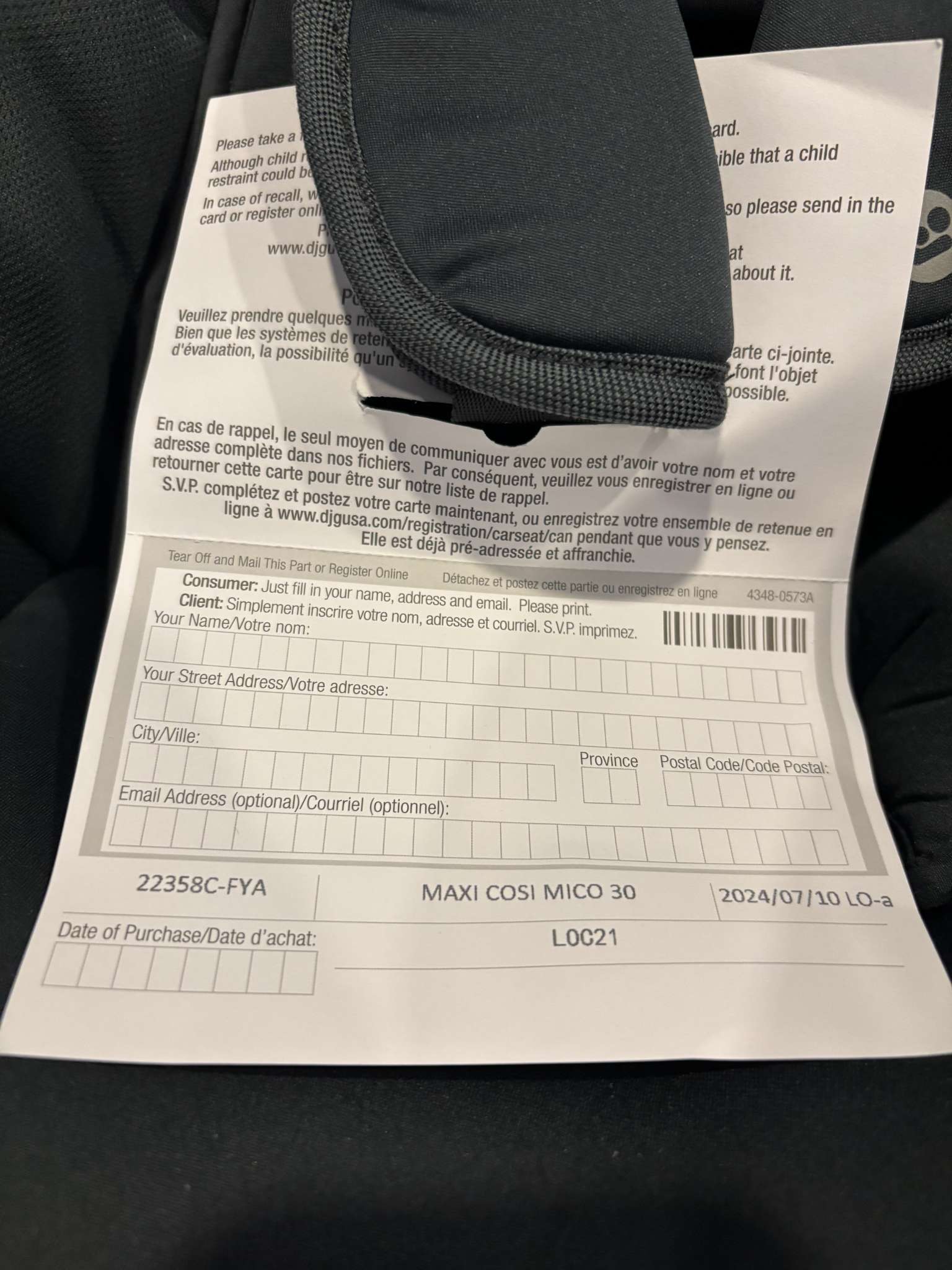 Manufacture's Date for new car seat and base: 2024/07/10.