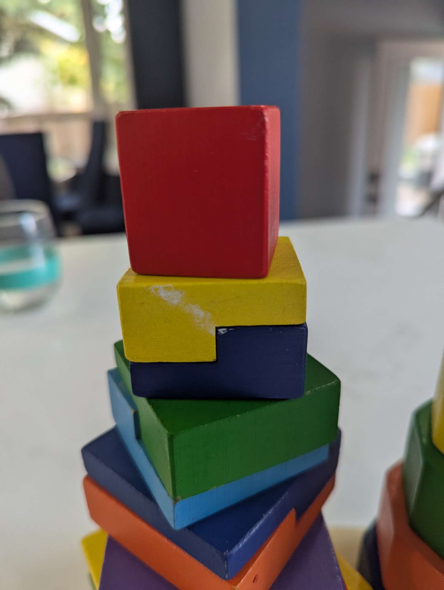 Some small chips in paint from regular use and a tiny bit of white paint on two blocks that do not affect use. (See photos)