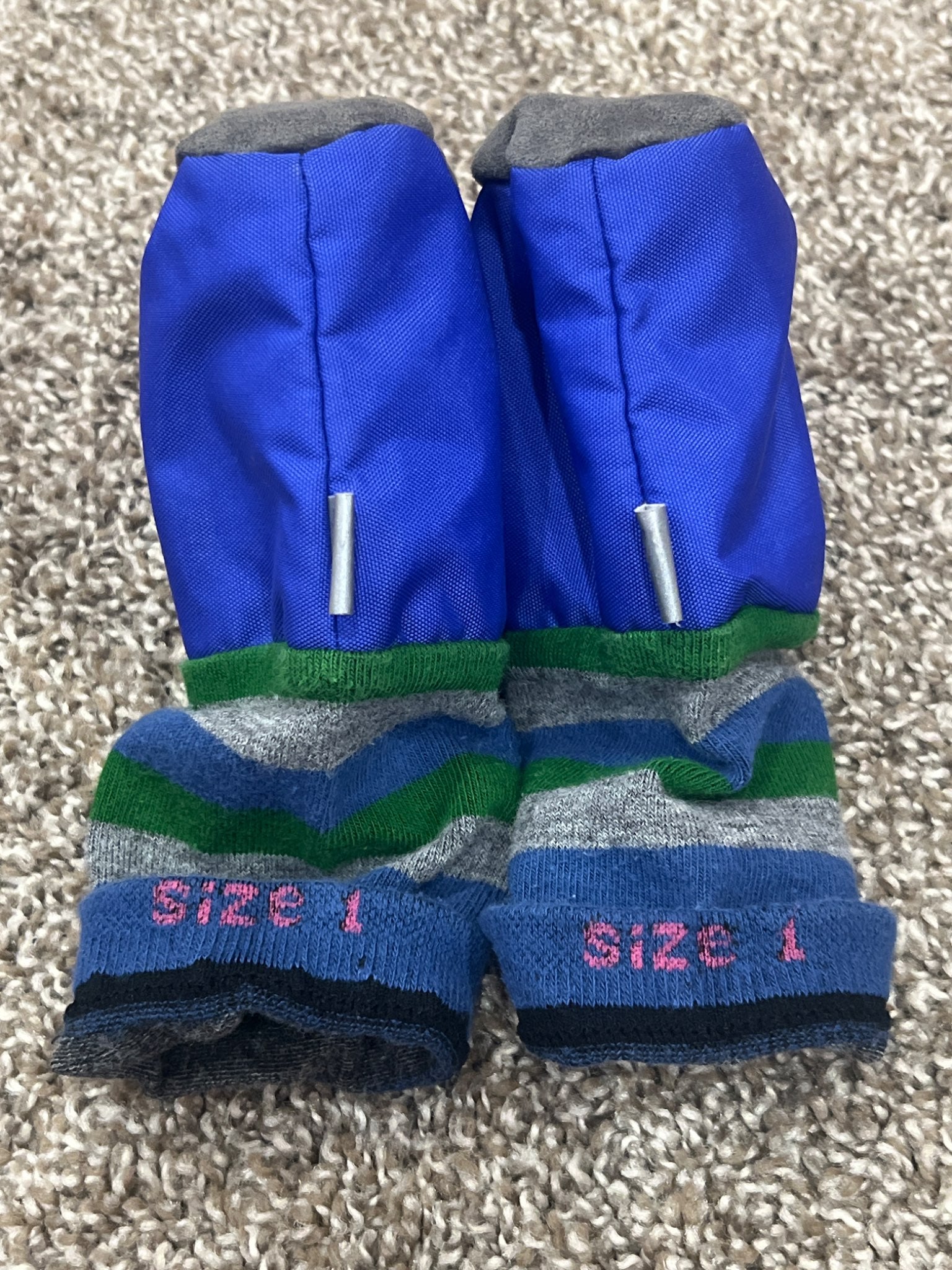 Description : Mimi Tens Soft Sole ‘Sock’ Boots, blue/green/grey striped sock tops, lined with thermal layer and grey soft soles, size 1 equivalent approximately to a size 6.5T, Excellent Used Condition (EUC). MSRP: $36.95. Made in Canada!