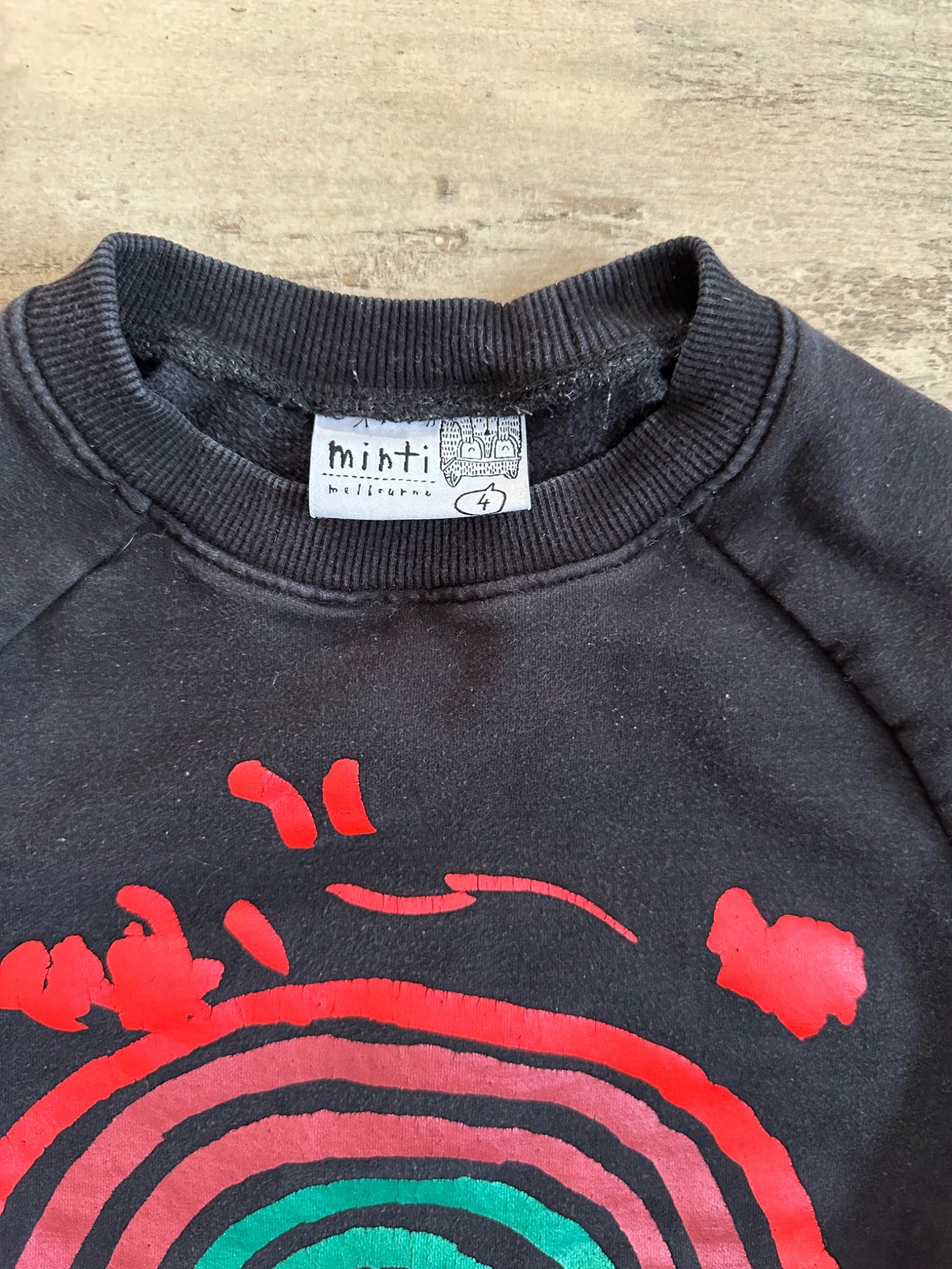 Description : Cool black sweatshirt (nice thick weight) with pockets and a rainbow screen print on front that reads “have a wonderful day” from Australian brand Minti.