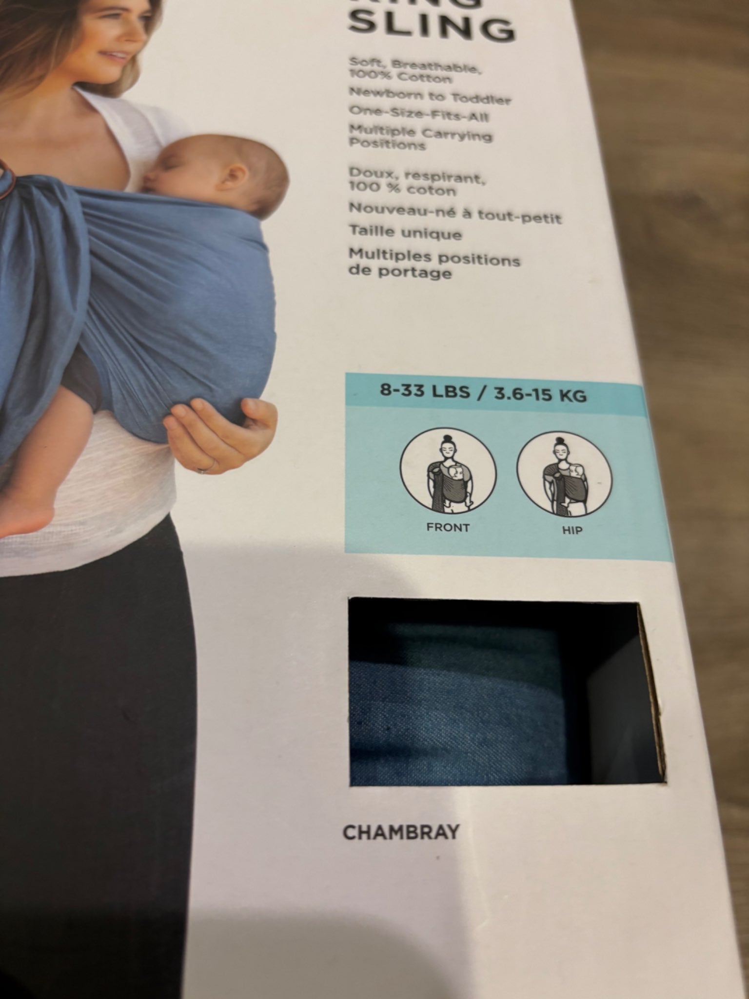 Description : Never open, seal intact 100 percent cotton - Intended for babies from 8 to 33 lbs. • Can be used in front or hip carry positions. • MOBY Ring Slings are 84.25 inches long from end to end.