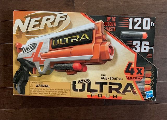 Take on opponents with the power and precision of the single-shot Nerf Ultra Four blaster. Front-load 1 dart into the barrel, pull back the handle to prime the blaster, and press the trigger to fire. It has on-board storage for 2 darts so you can reload fast. Includes 4 Nerf Ultra darts that are compatible only with Nerf Ultra blasters. Send darts flying through the air up to 120 feet (36 meters)! Eyewear recommended (not included).