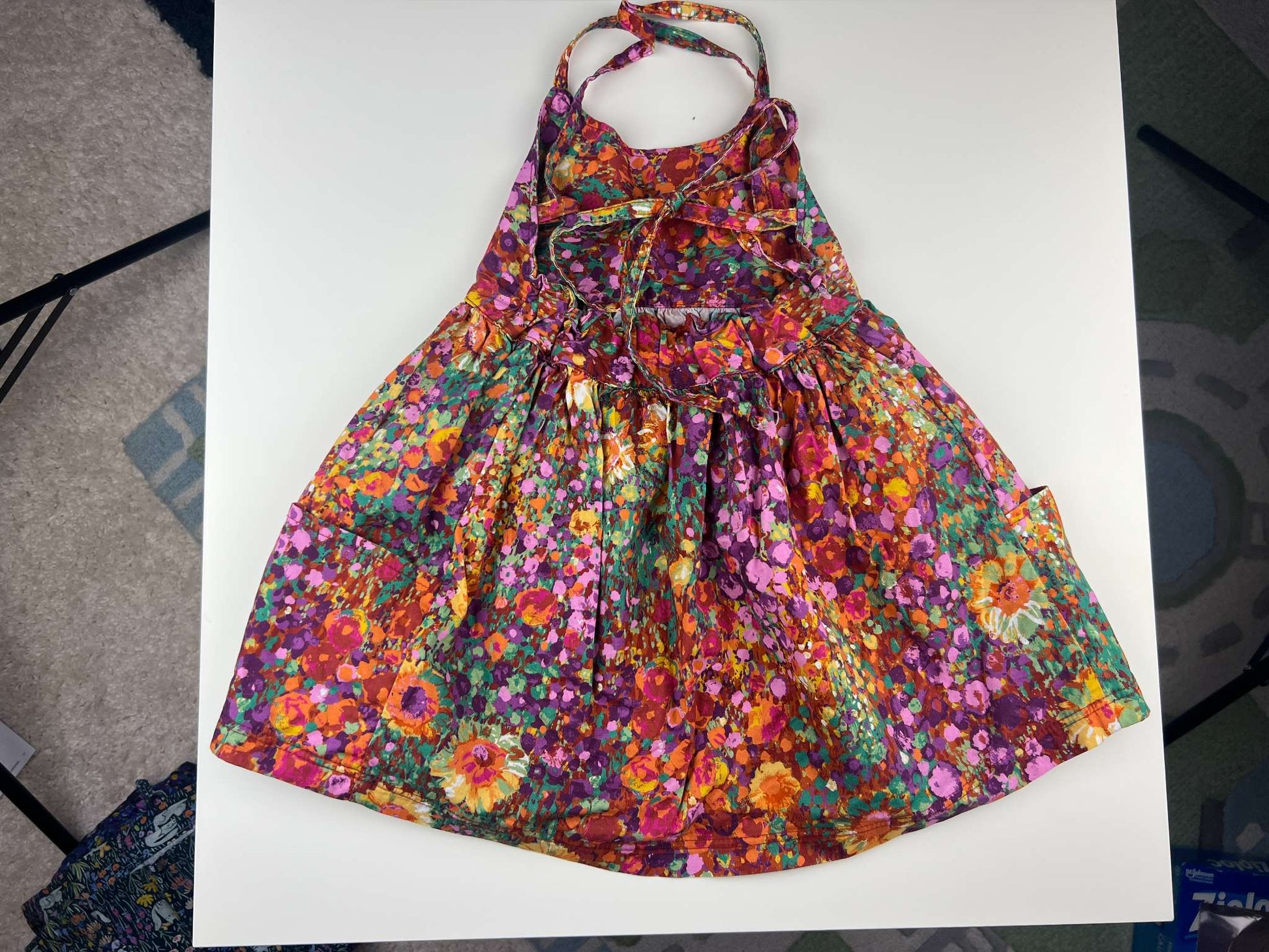 Description : Freya dress that ties in the back from Nest and Nurture. Absolutely gorgeous painted sunflower fabric in beautiful shades reminiscent of summer. Fits 2T. Purchased new from Nest and Nurture for $55.