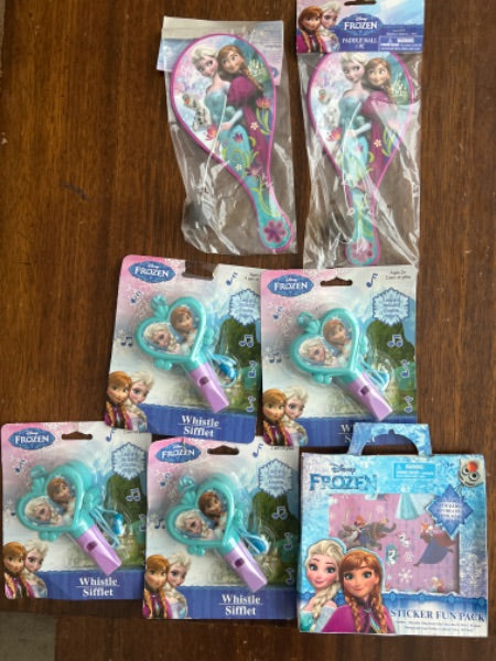 Description : New Disney frozen birthday party supplies for loot bag 4 large whistles 1 sticker package with many stickers 2 paddle ball sets