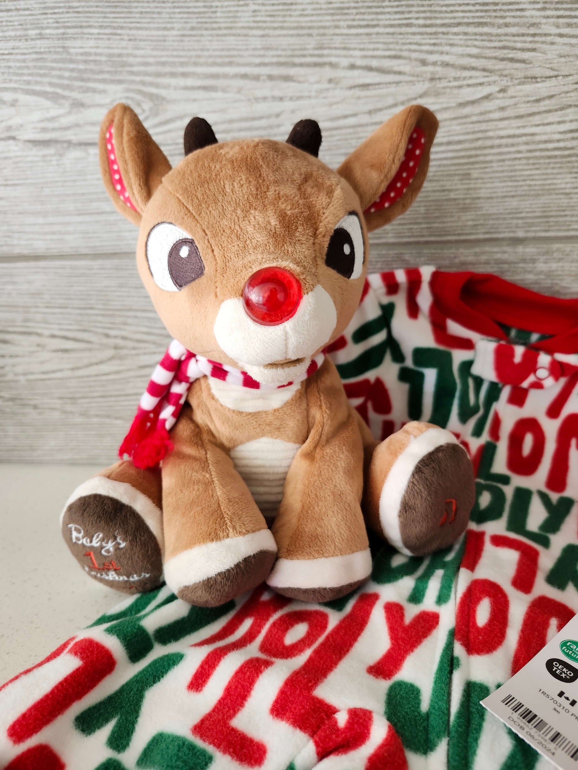 Description : Newborn Christmas Bundle. Carter's Holly Jolly Fleece Sleeper (3 month, NWT). Musical Baby's 1st Christmas Rudolph Plush (NWOT, plays Rudolph the Red-Nosed Reindeer song).