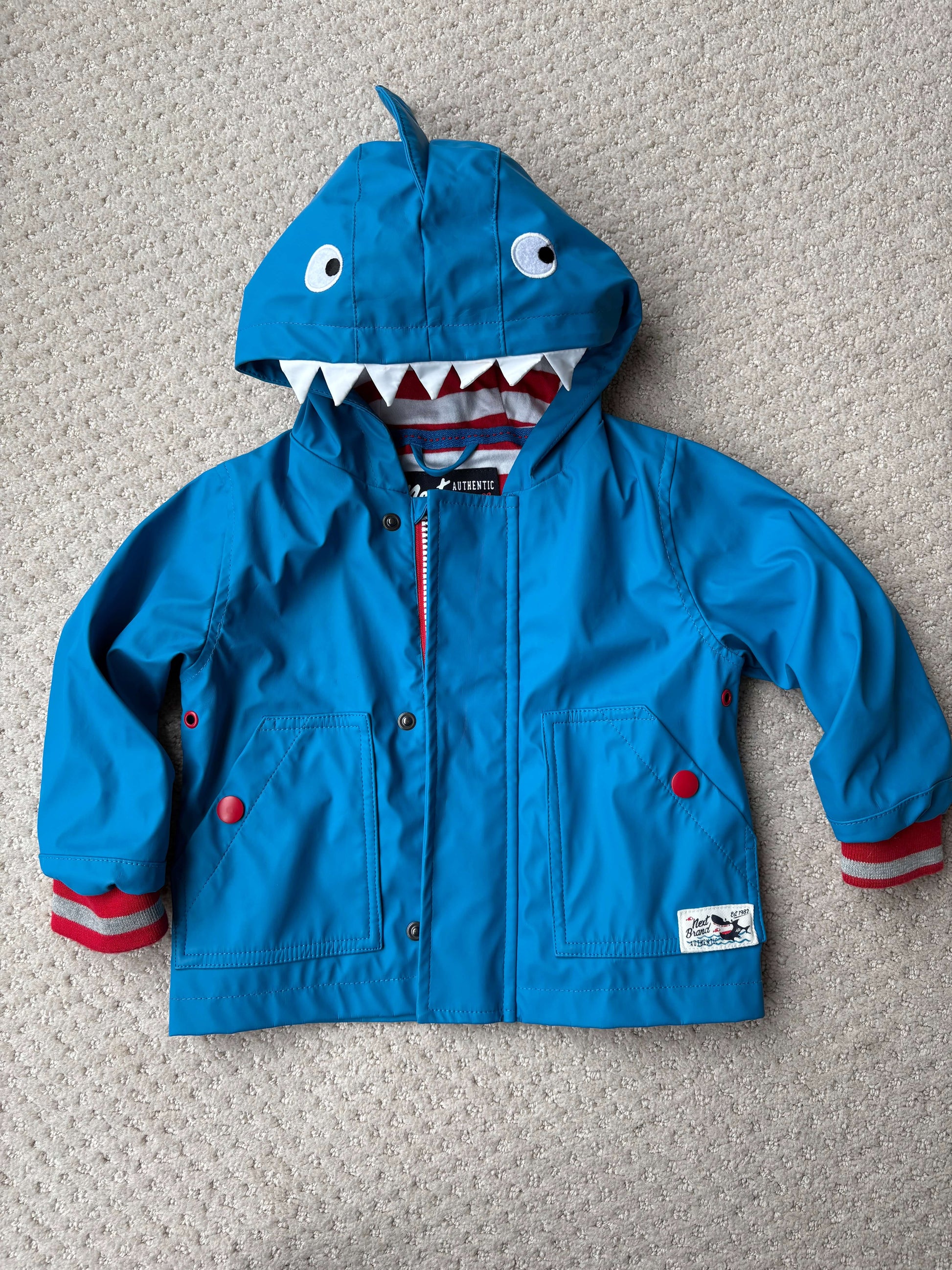 Description : Next 🇬🇧 - blue shark rain jacket, 9-12 months, insulated, cotton cuffs, zipper and snaps, pockets.