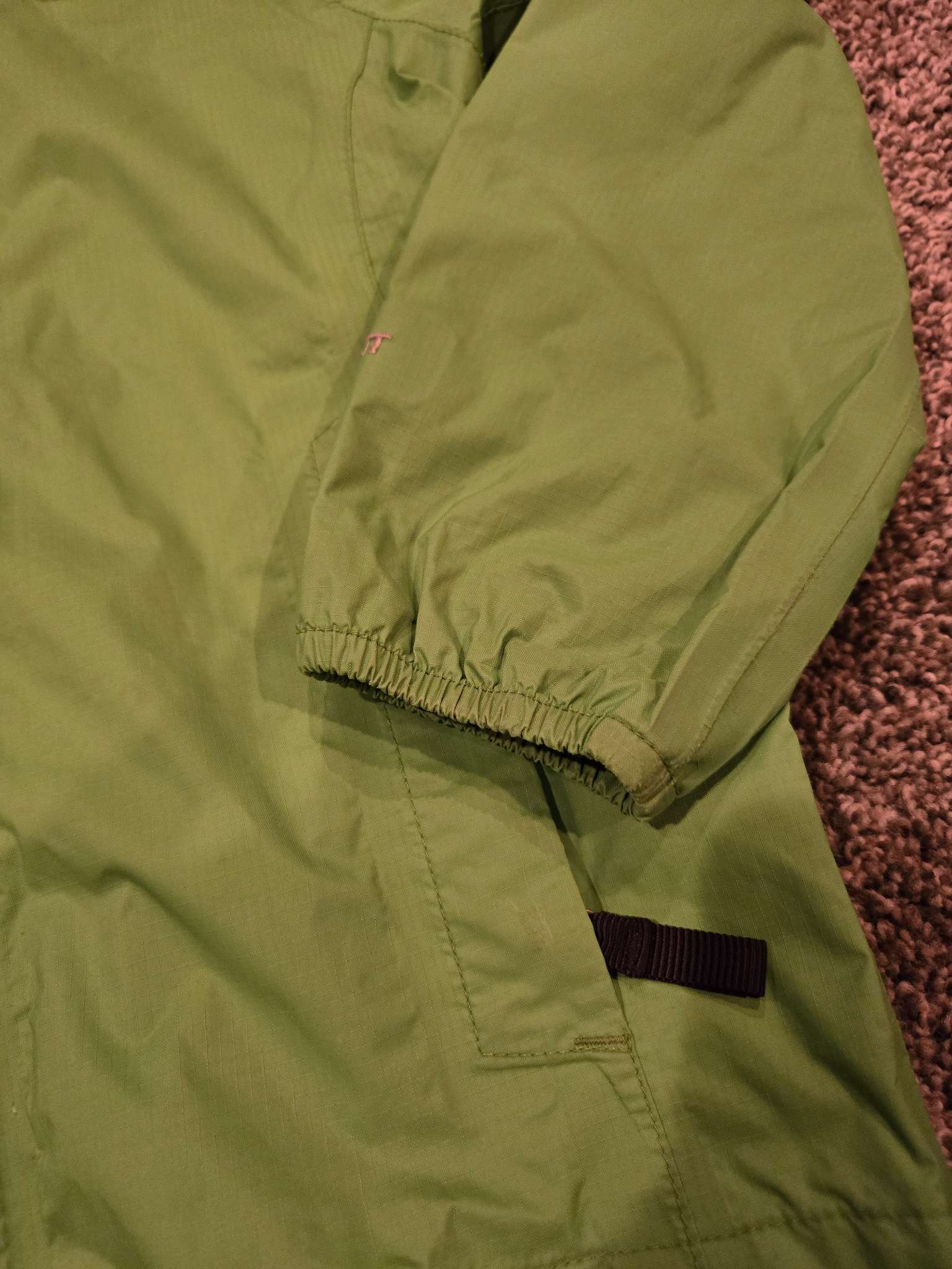 Description : Some wear on cuffs/around pocket. Great condition otherwise. Hood rolls up into coller with velcro closure