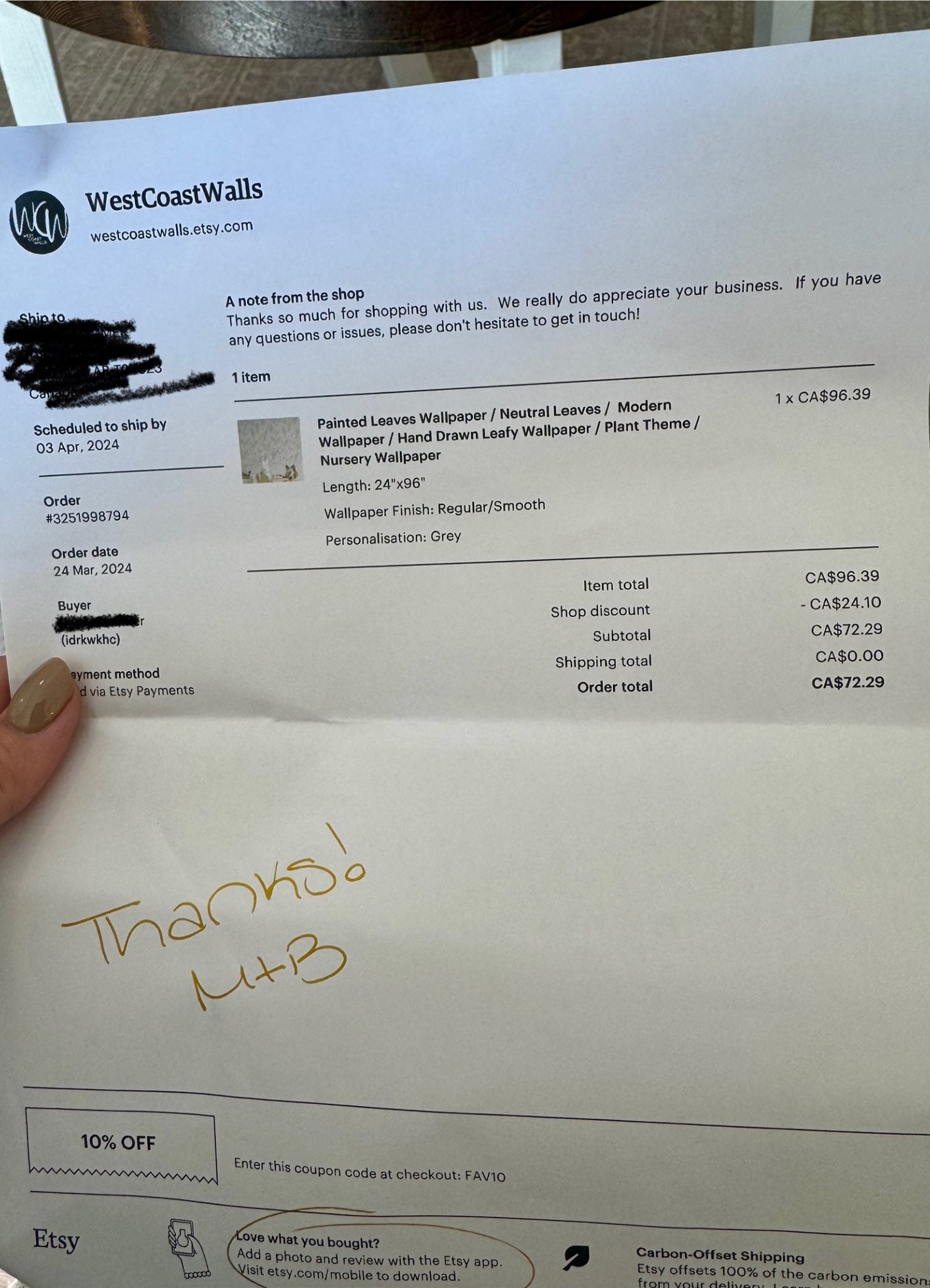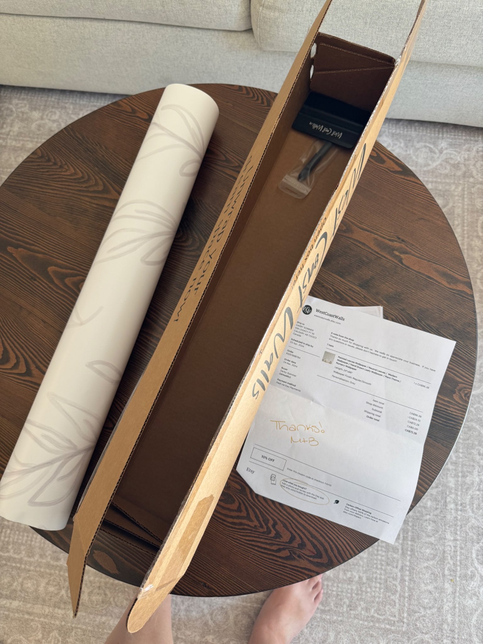 Description : Grey on white painted leaves wallpaper from west coast walls. Length is 24”x96”. Bought and never used,