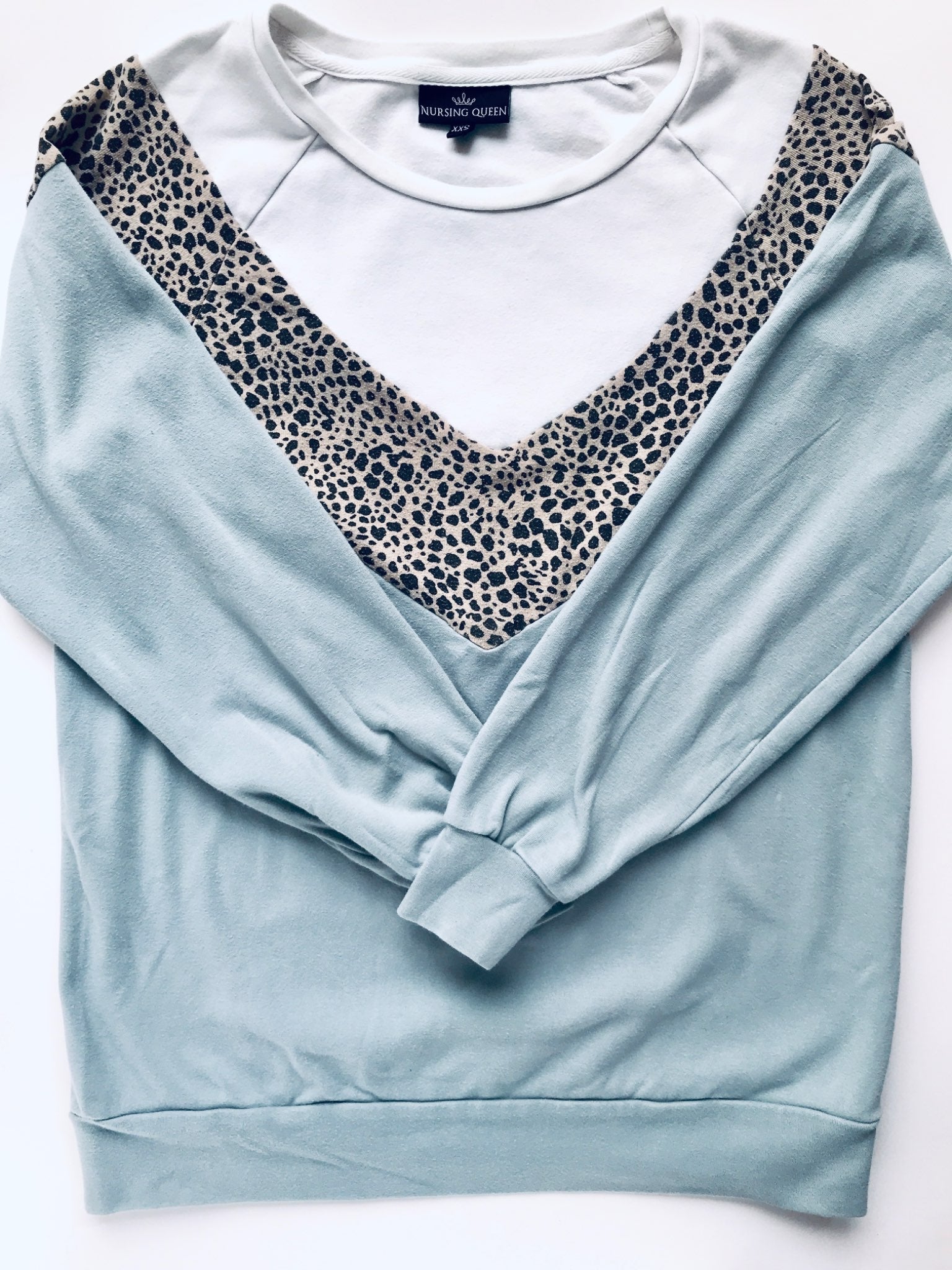Description : Size extra extra small (but fits like xs) Nursing Queen oversized chevron breastfeeding sweatshirt in cheetah sage. Nursing access through two slant zippers that are hidden along the color block line. In very good used condition with minor wash wear/pilling, mostly on patterned panel, and no stains, holes or flaws. Always washed with free and gentle detergent. Pet and smoke free home.