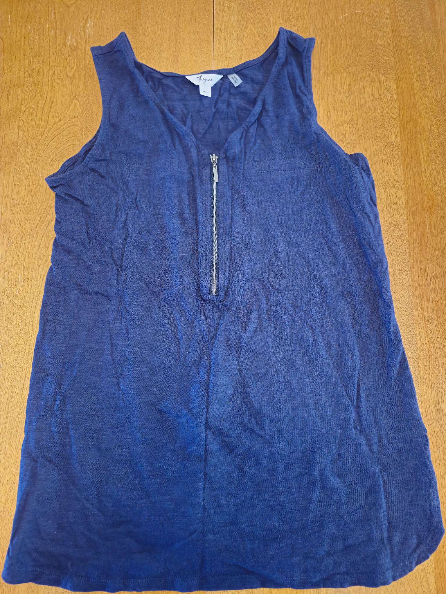 Description : Thyme Maternity tunic with 2 side zippers for easy nursing. Blue flowy sleeveless top with center zip, not a nursing top specifically but worked well as one. Size x-small to small.