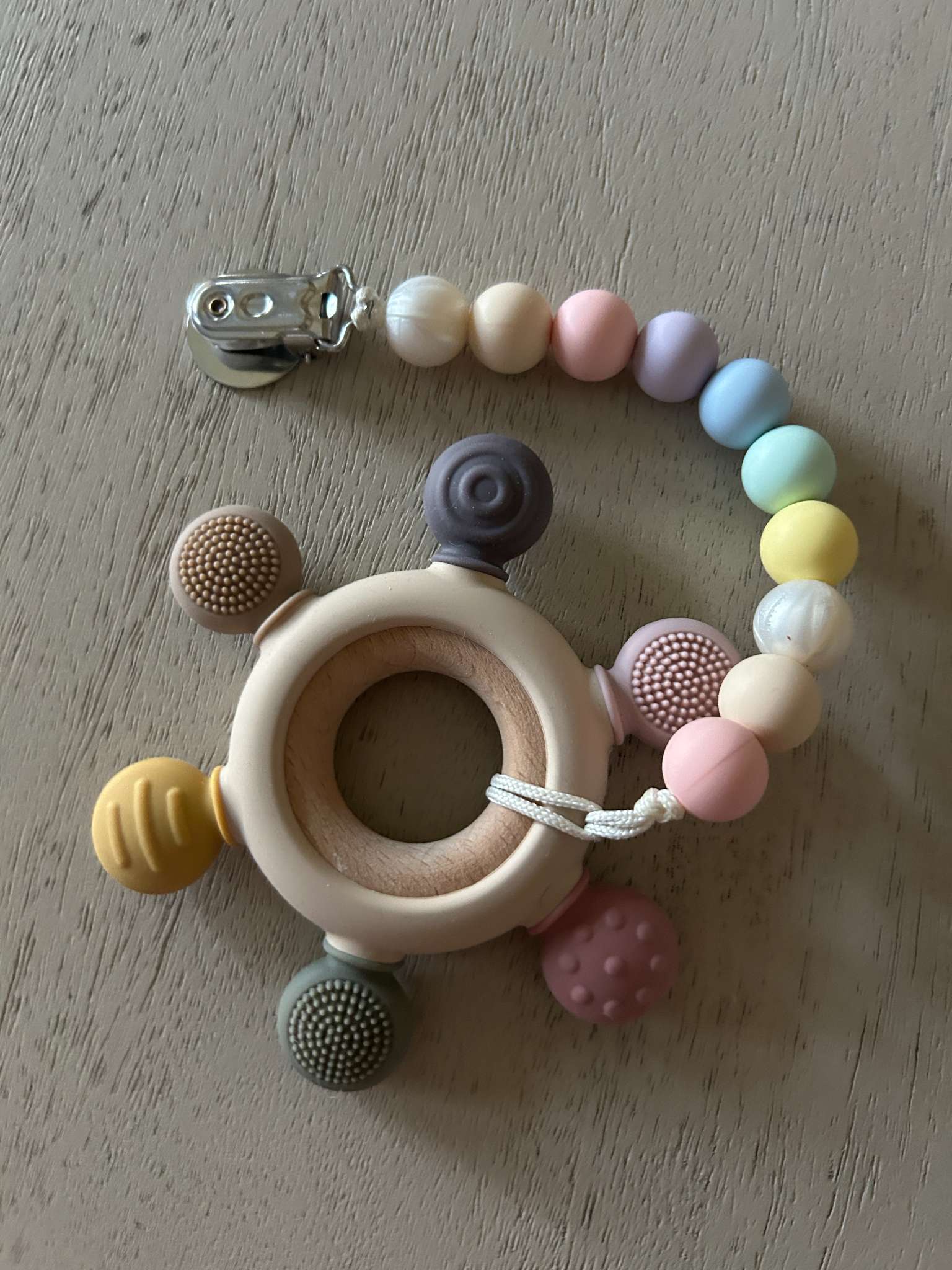 Description : Pacifier clip with pastel silicone beads and wooden/silicone teether toy Baby did not use at all so like new