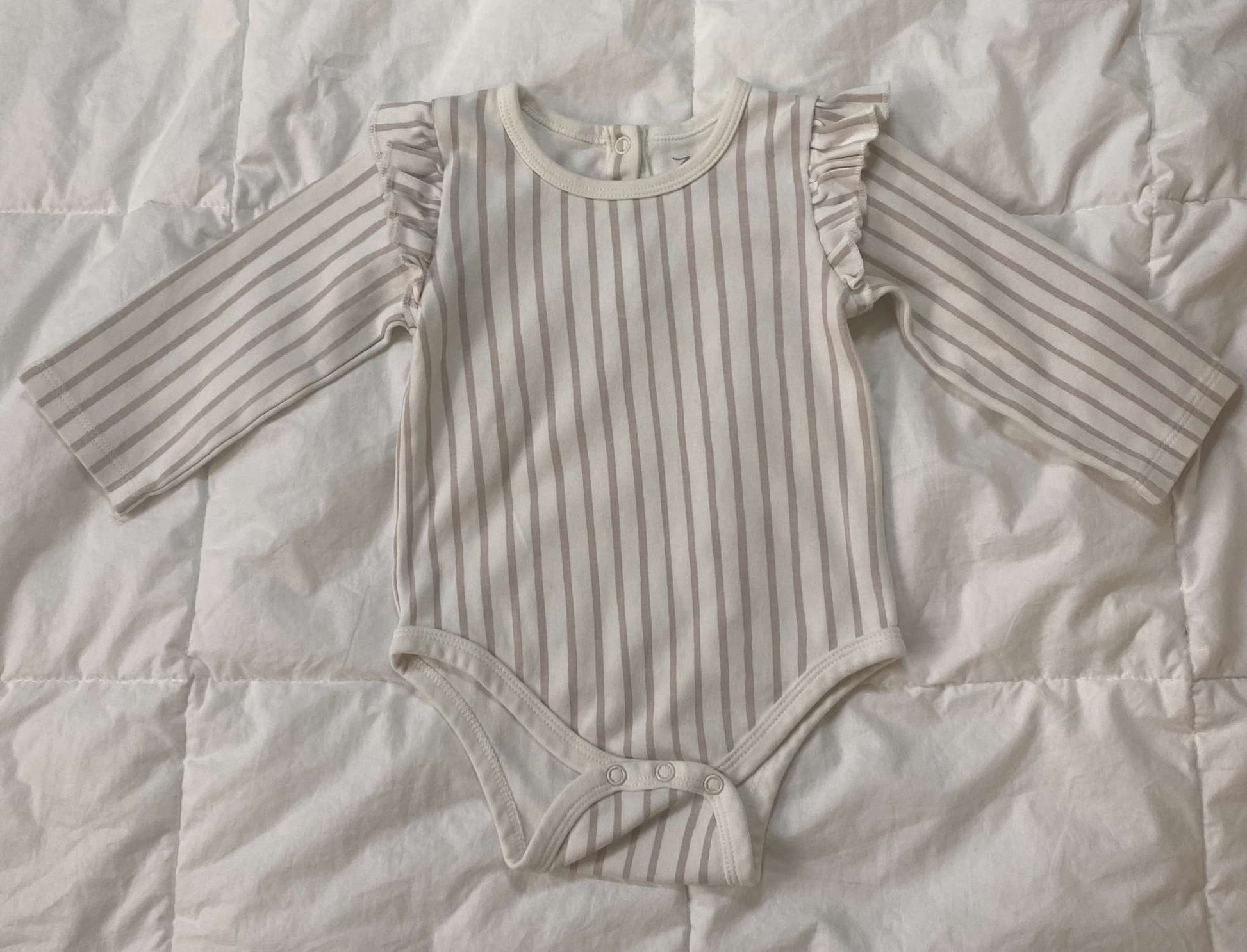 Description : Sweet vertical stripes with ruffles at the shoulders. Snaps in the gusset for easy changes, and snaps up the back to make them easy to put on. Made from certified organic cotton, they stretch and move with your little one guaranteeing ultimate comfort against their delicate skin and are made to last. Organic Cotton & Dyes Ethically Made