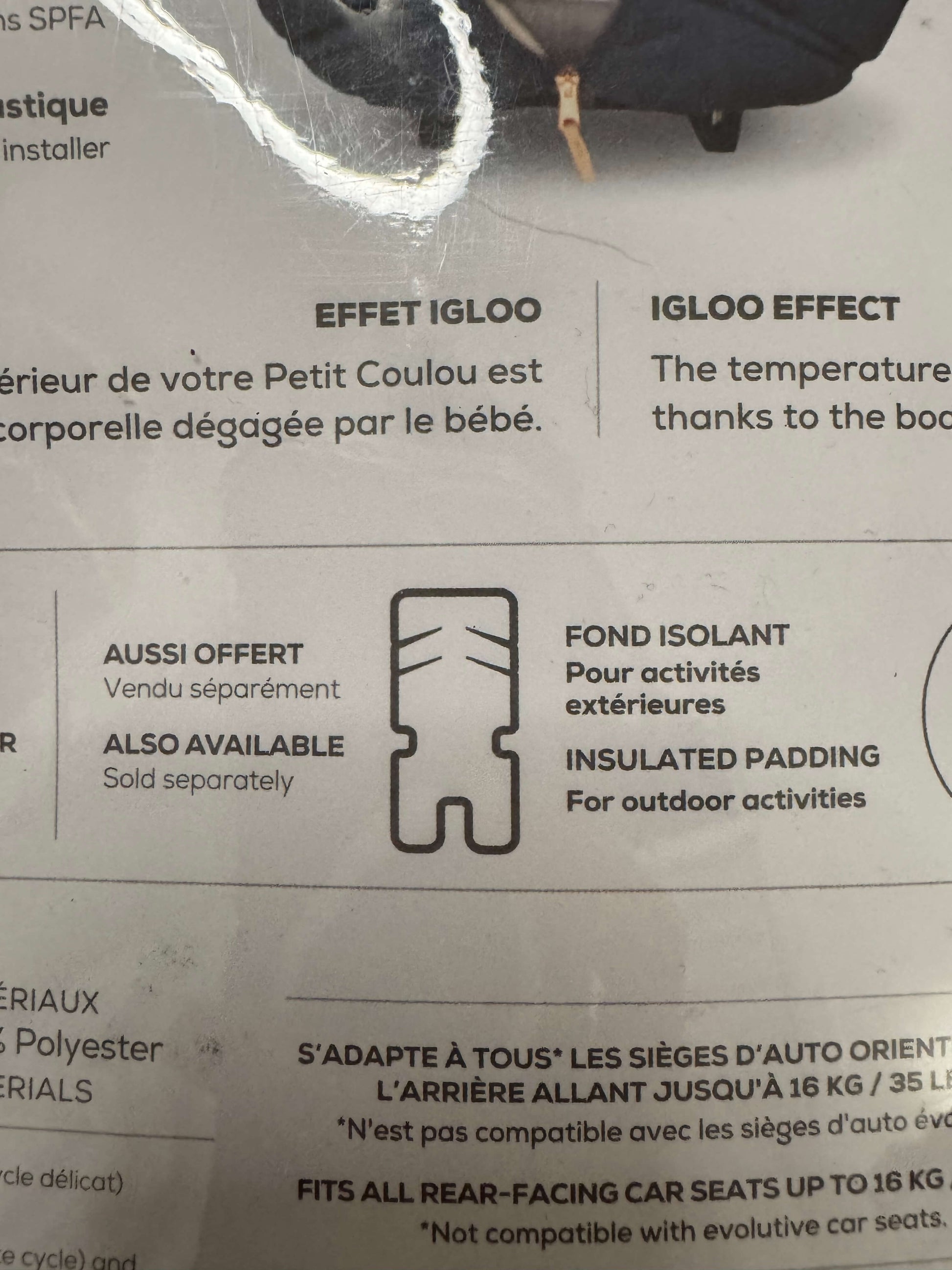 Description : Winter cover for infant car seats. Lined with plush, warm fabric for winter months. Used only a handful of times. Comes with extra padded insert for added warmth and comfort (normally sold separately). Paid nearly $200 for backing insert and cover. Like-new condition. Rated to -30 degrees. From the website: The Petit Coulou winter car seat cover is an essential accessory for parents of little ones. It can be easily removed thanks to its elastic base. Quick and easy! Our car seat winter cover won't shift or slip when you're out and about in windy conditions. Thanks to its lightweight, water-repellent material and igloo effect, your baby will be protected from the elements and unwanted touches. The only cover on the market to offer structural support to prevent sagging. Safety and comfort are our pledge of quality to give parents peace of mind.