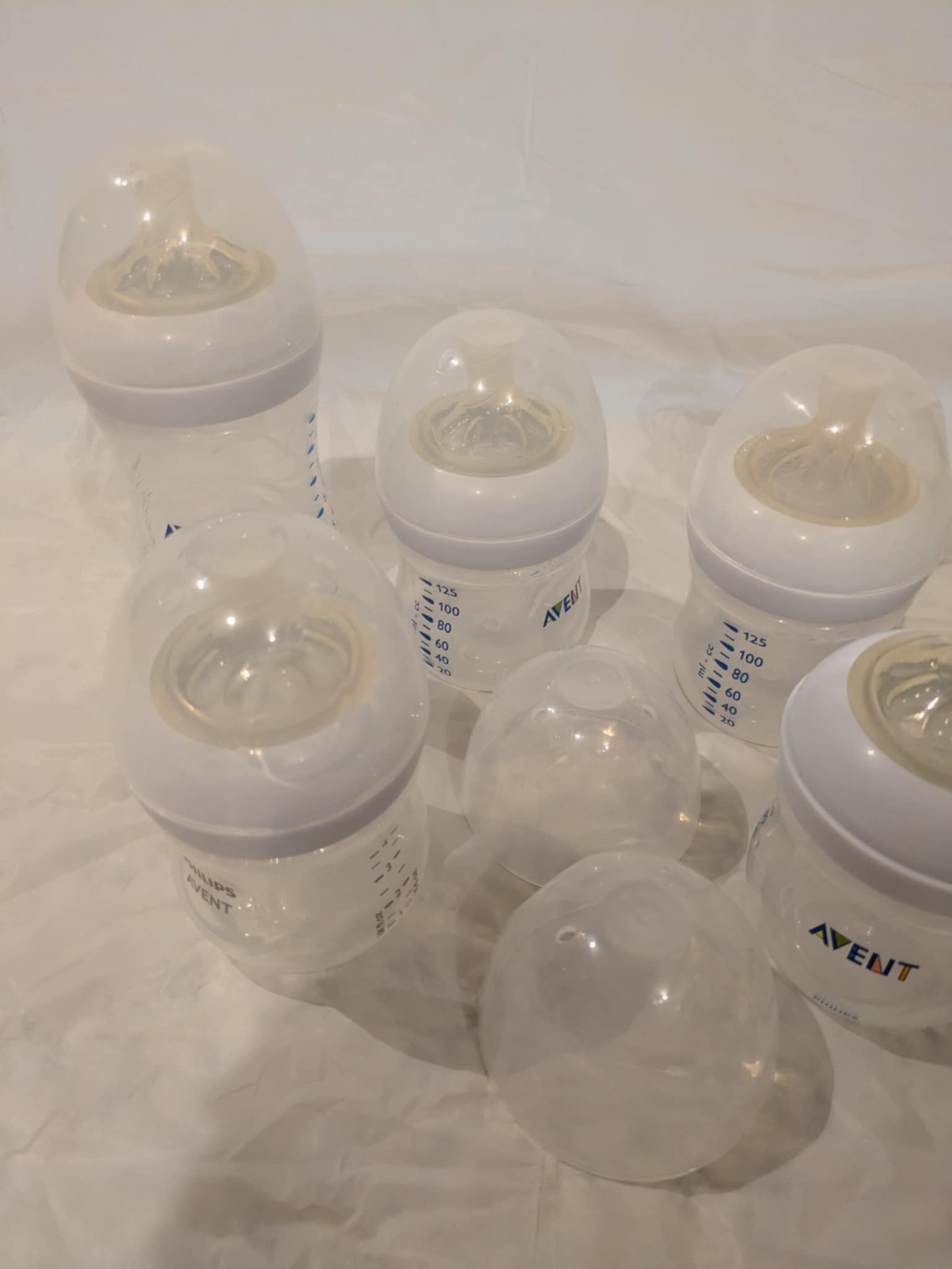 Description : Set of Philips Avent Bottles and Manual Breast Pump for Avent bottles. Two tall and 4 small bottles, came in a starter set. Both our babies didn't take to the avent bottles, so I only Used them a handful of times with manual pump. Pump has flange included (just missed putting it on in photograph), shown in alternate photos! Nipples are not included (I took the photos before I realized I couldn't include them for sale since they were used) MRSP is $50 for starter set and $50 for manual hand pump. Manual pump was a lifesaver for roadtrips, if you like to travel.