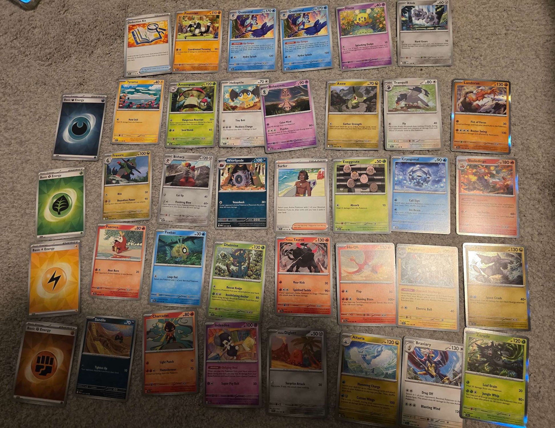 Description : Set of 38 Pokemon Trading Card Game (TCG) cards (English Version) Each set includes: 4 Uncommon/Rare Shiny cards 30 Standard Common and/or Uncommon cards (May contains a number of duplication cards) 4 Energy Cards All Cards are authentic and in Mint/Excellent conditions as they are open from packs and stored, never been played with. Most cards are from Pokemon Surging Sparks expansion and may contain other card expansion series, please references to the photos for actual cards containing in this set. Good for collections or Build a Deck to start playing in the Pokemon TCG world!