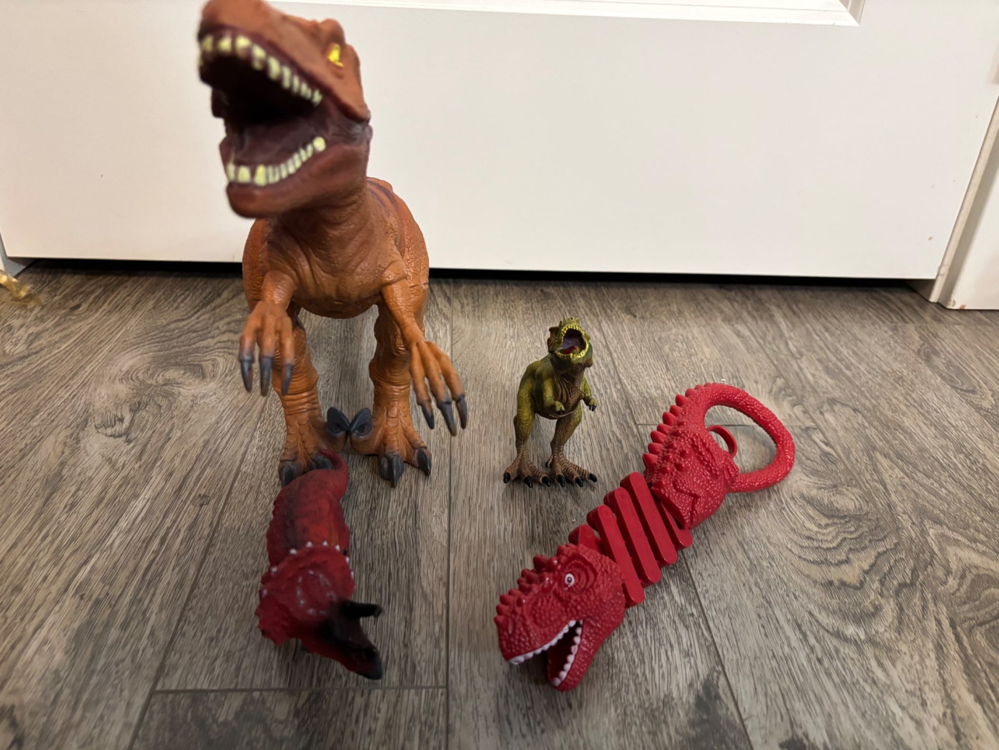 Description : 3 dinosaur toys and a dinosaur grabber toy. Raptor, T-Rex, and stegosaurus