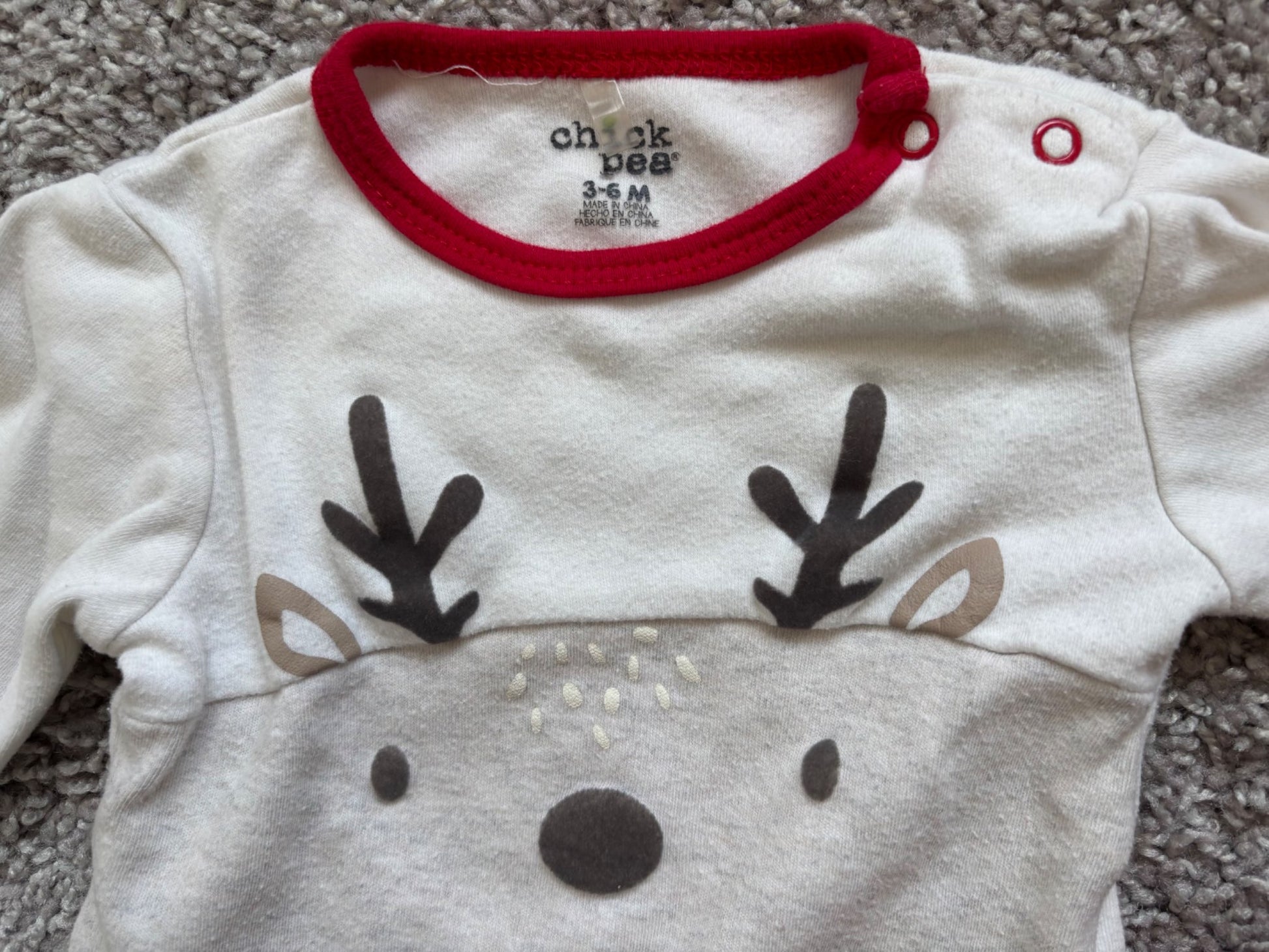 Description : Reindeer shirt and red pants, Chick Pea brand size 3-6 months.