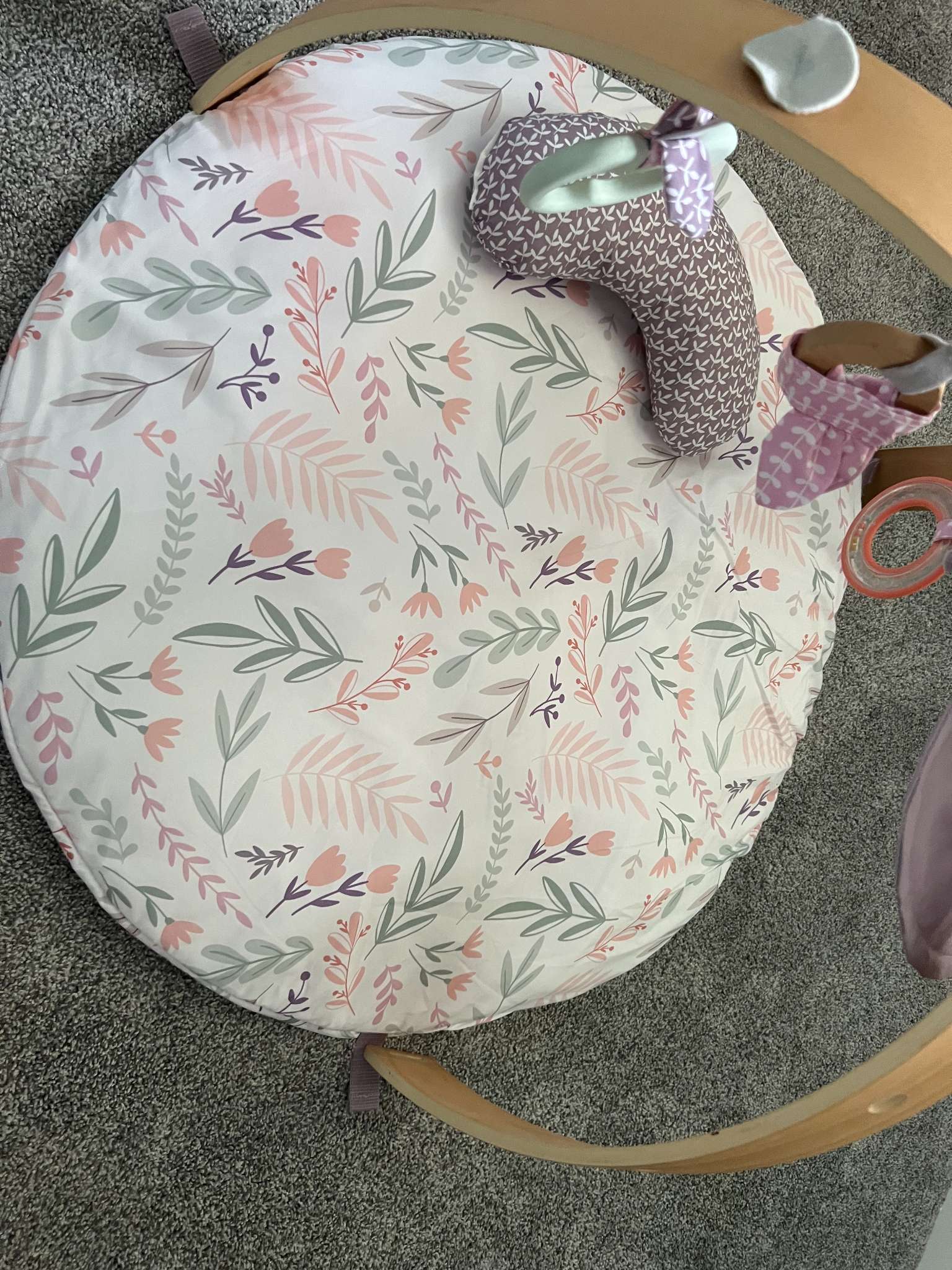 Description : We have two of these in excellent condition, both barely used. The duvet is reversible with two neutral prints and folding wooden toy bar. Comes with tummy time pillow and all 5 detachable toys. No marks, no stains, or any rips/tears. Still is very plush and comfy!