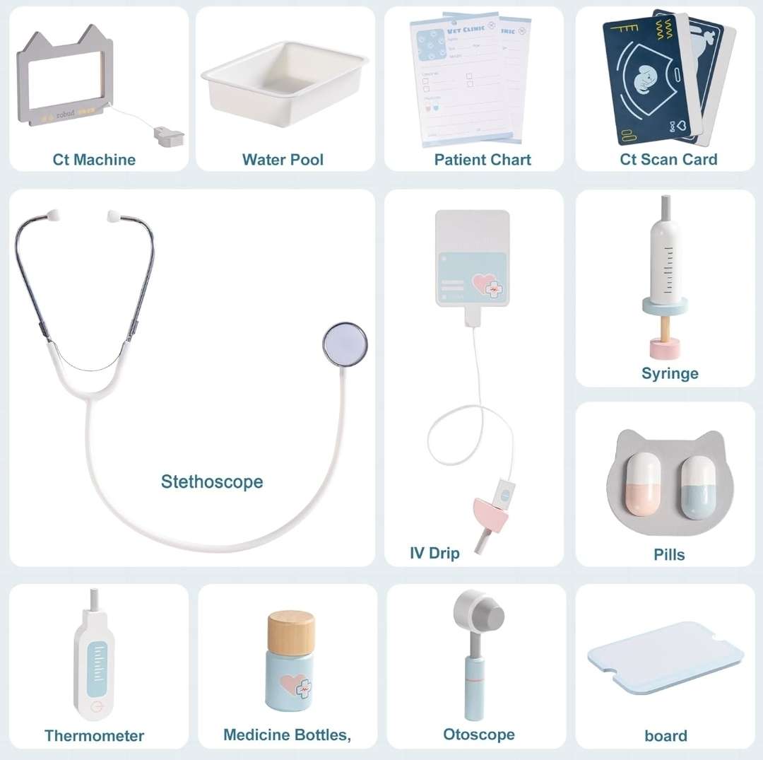 Description : Robud Toddler Veterinarian Playset stand Brand new in box, never assembled. Wooden playset with an adjustable doctor's tray stand and 12 accessories