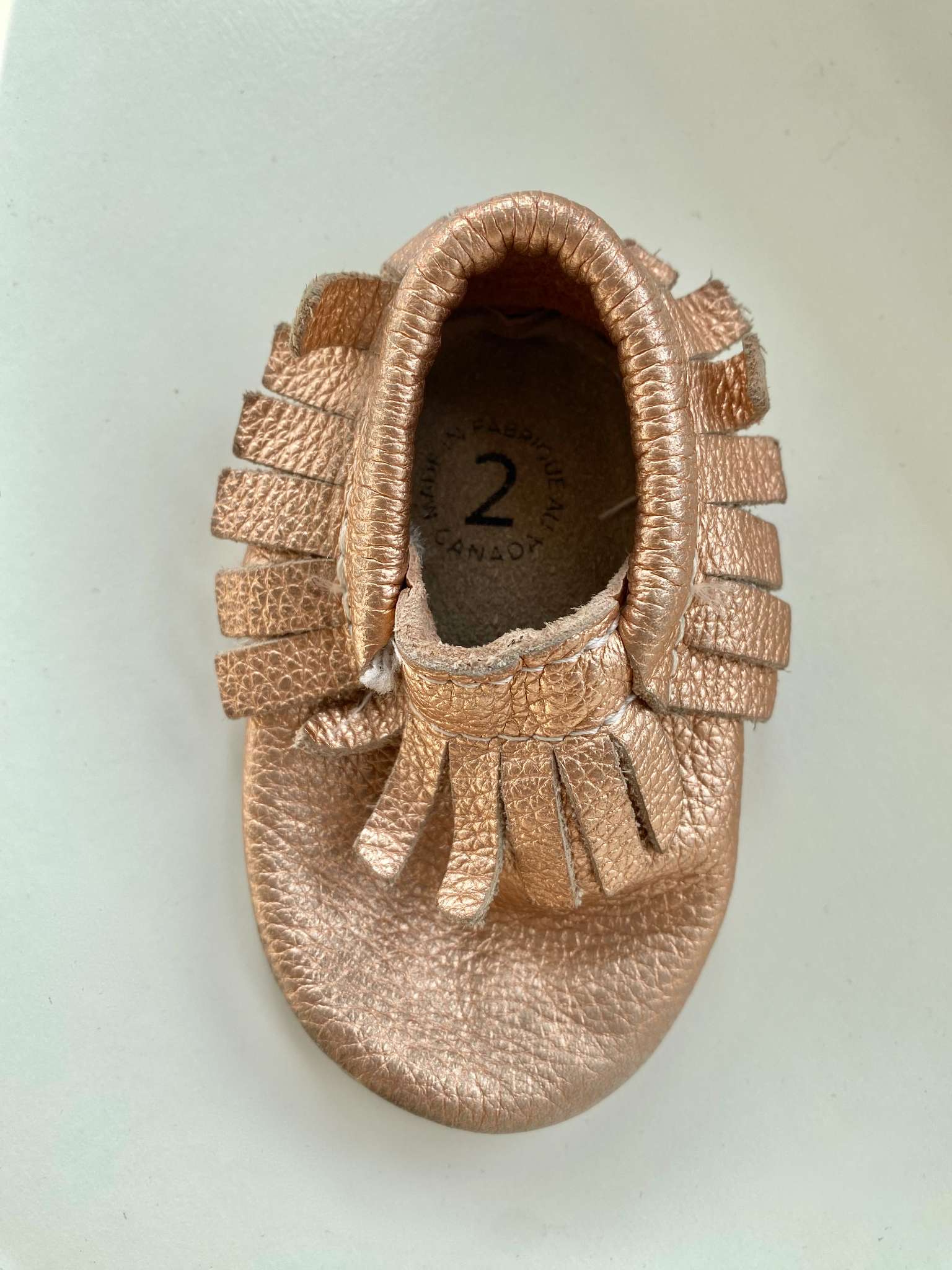 1) Rose Gold Size 2 Minimoc, elastic design makes them easy to stretch over tiny baby foot