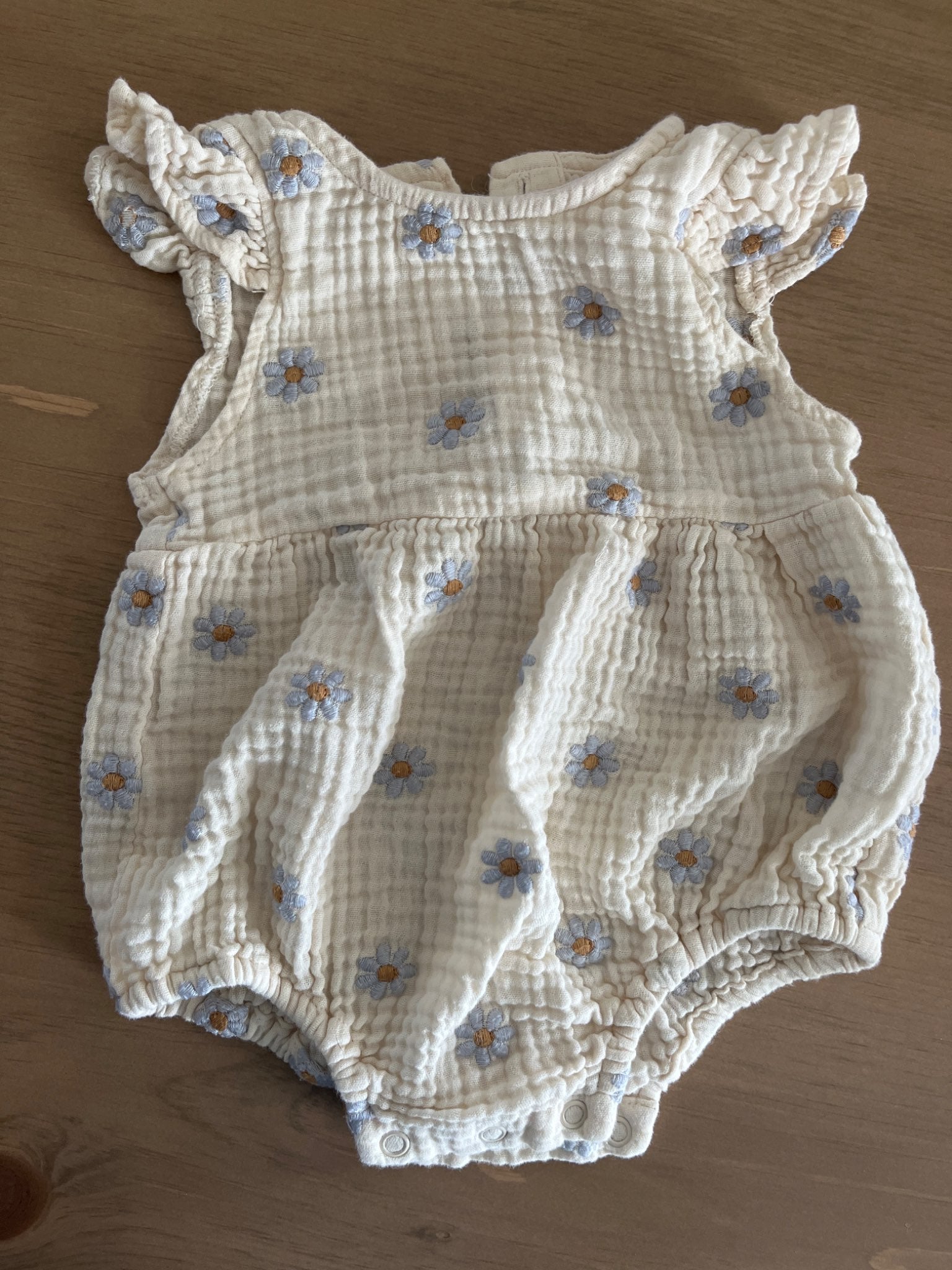 Description : Adorable romper for baby girl. Only worn a handful of times and still looks like new. Size 6-12 mos. Cream with purple daisies.