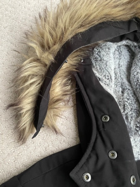 Description : Seraphine 3 in 1 jacket, black, size 6 petite, faux fur detachable collar, extra zip in section for maternity and/or carrying baby, soft lining.