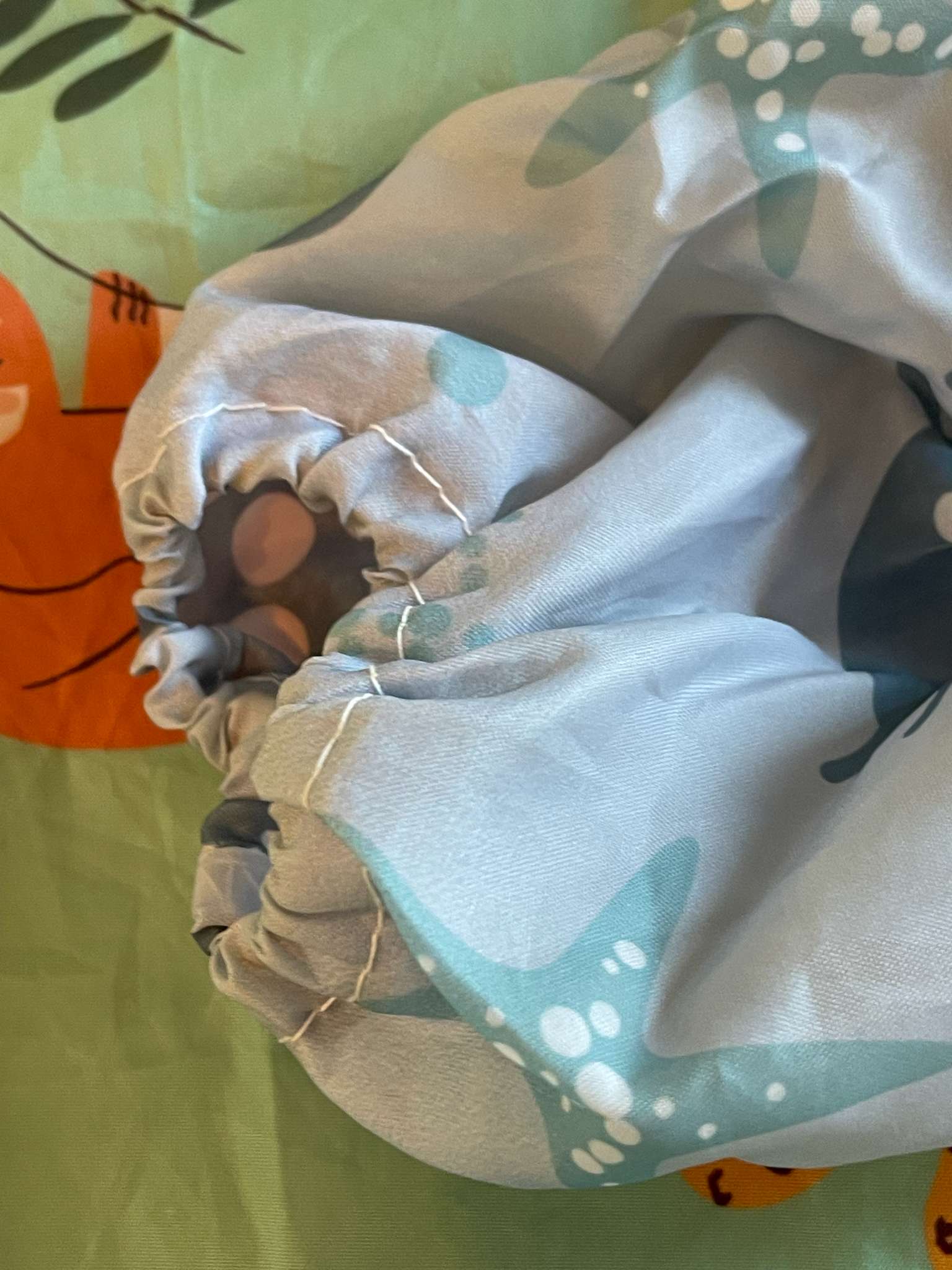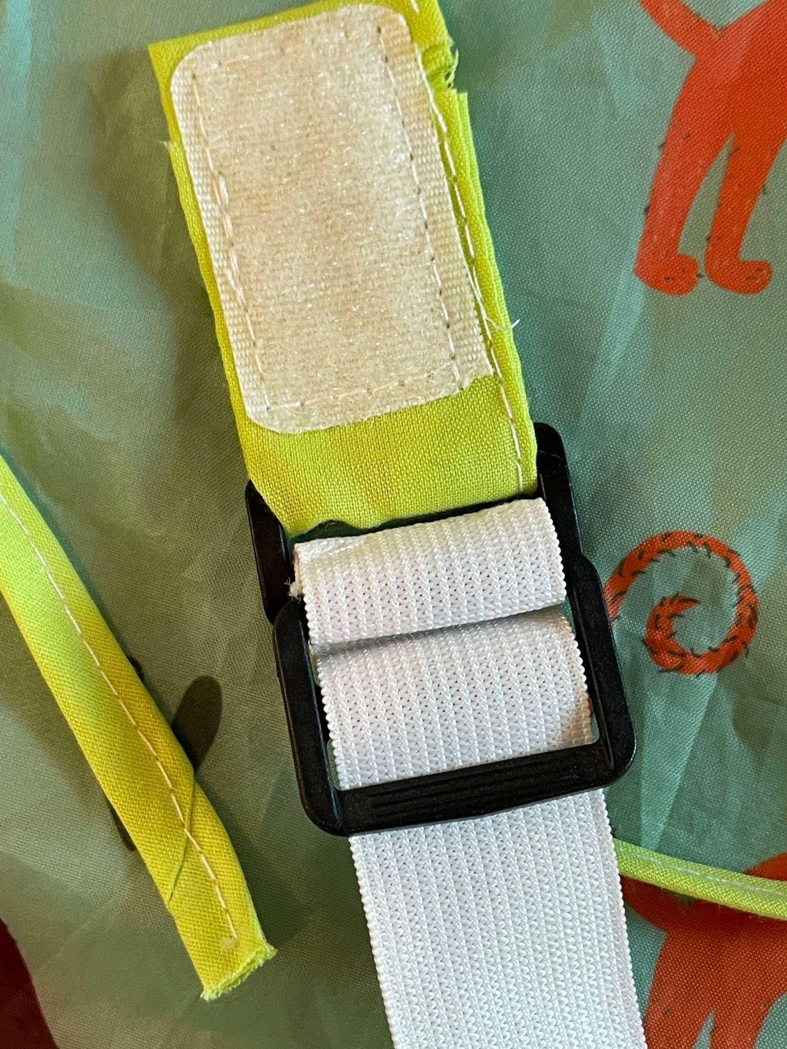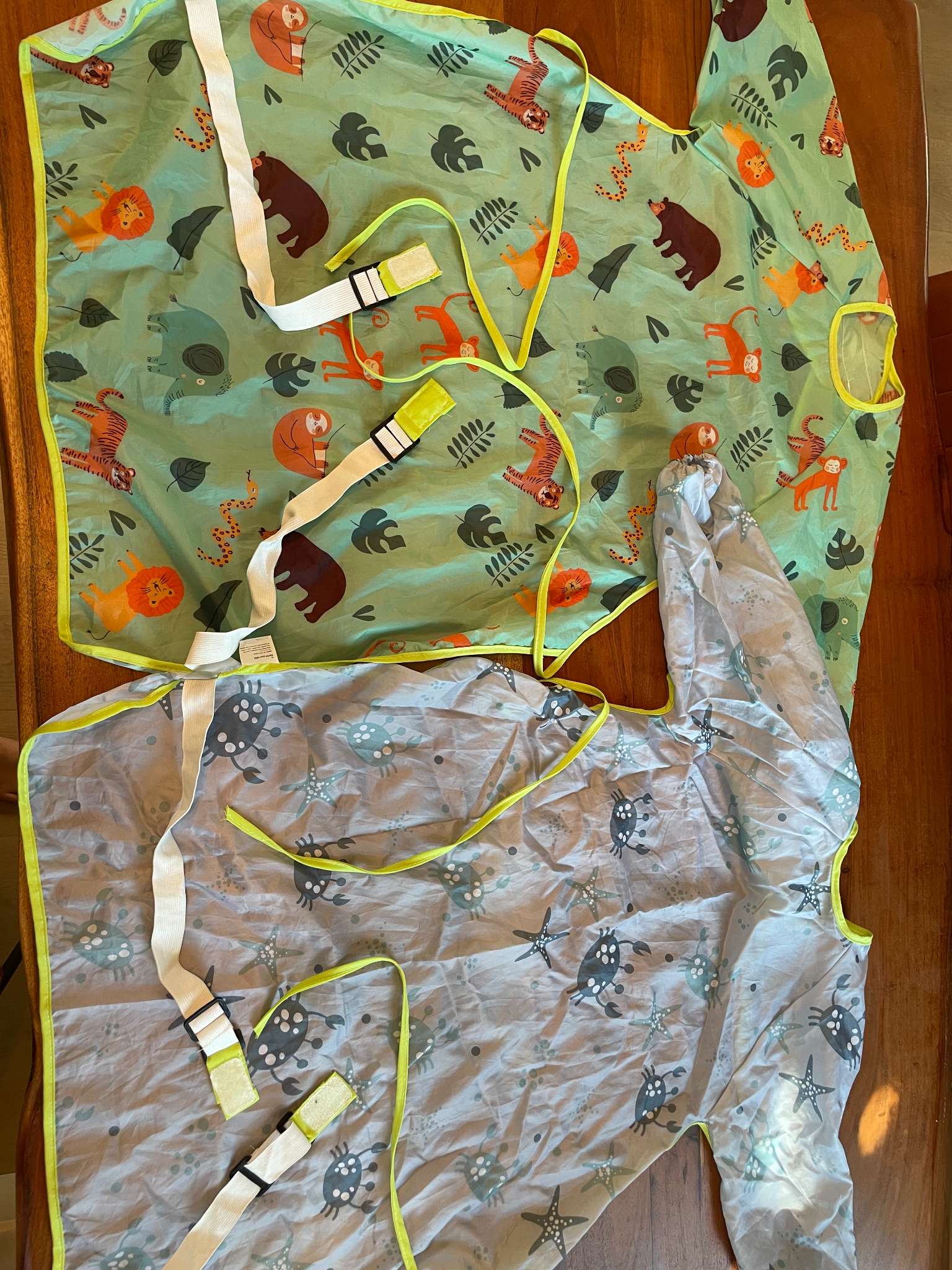 Description : Planning on letting your baby self feed? Want to make clean up a breeze? These bibs are the gold standard. We had several sets and loved them! These two were backups we kept at Grandma's etc. so they are in "like new" condition. All elastics and velcro are in perfect condition. They fit any highchair and are super adjustable.