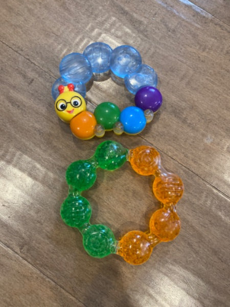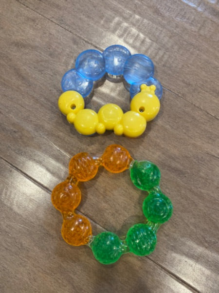 Description : Caterpillar one is full of water that freezes. Also is a rattle. Orange and green one is full of a gell that freezes Both excellent for new teeth coming in and soar gums No teeth marks.