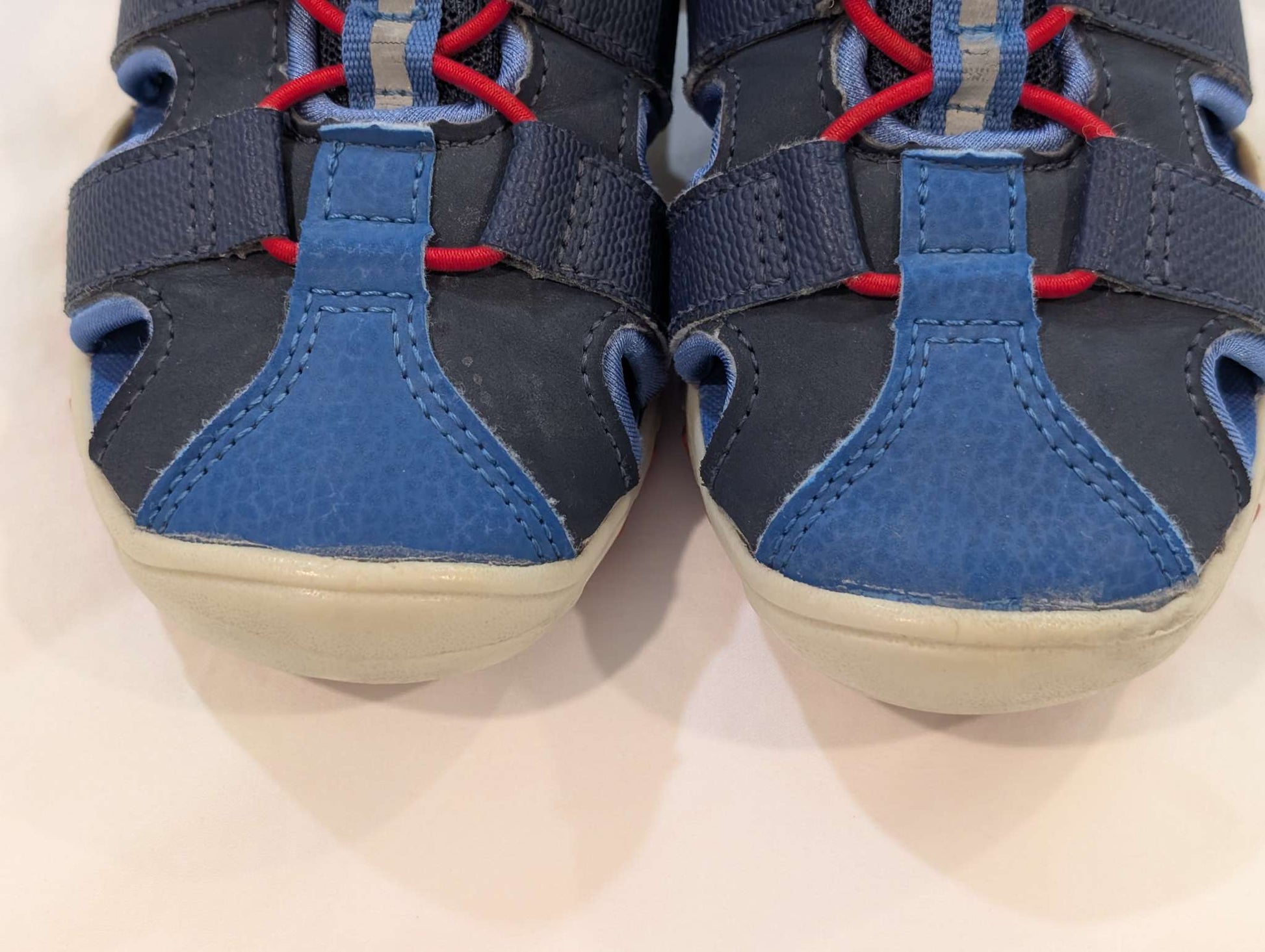 Description : Size 12 Velcro sandals, soles in great shape and very durable, some scuffs and wear noted in pictures, some cracking where the decals are bent