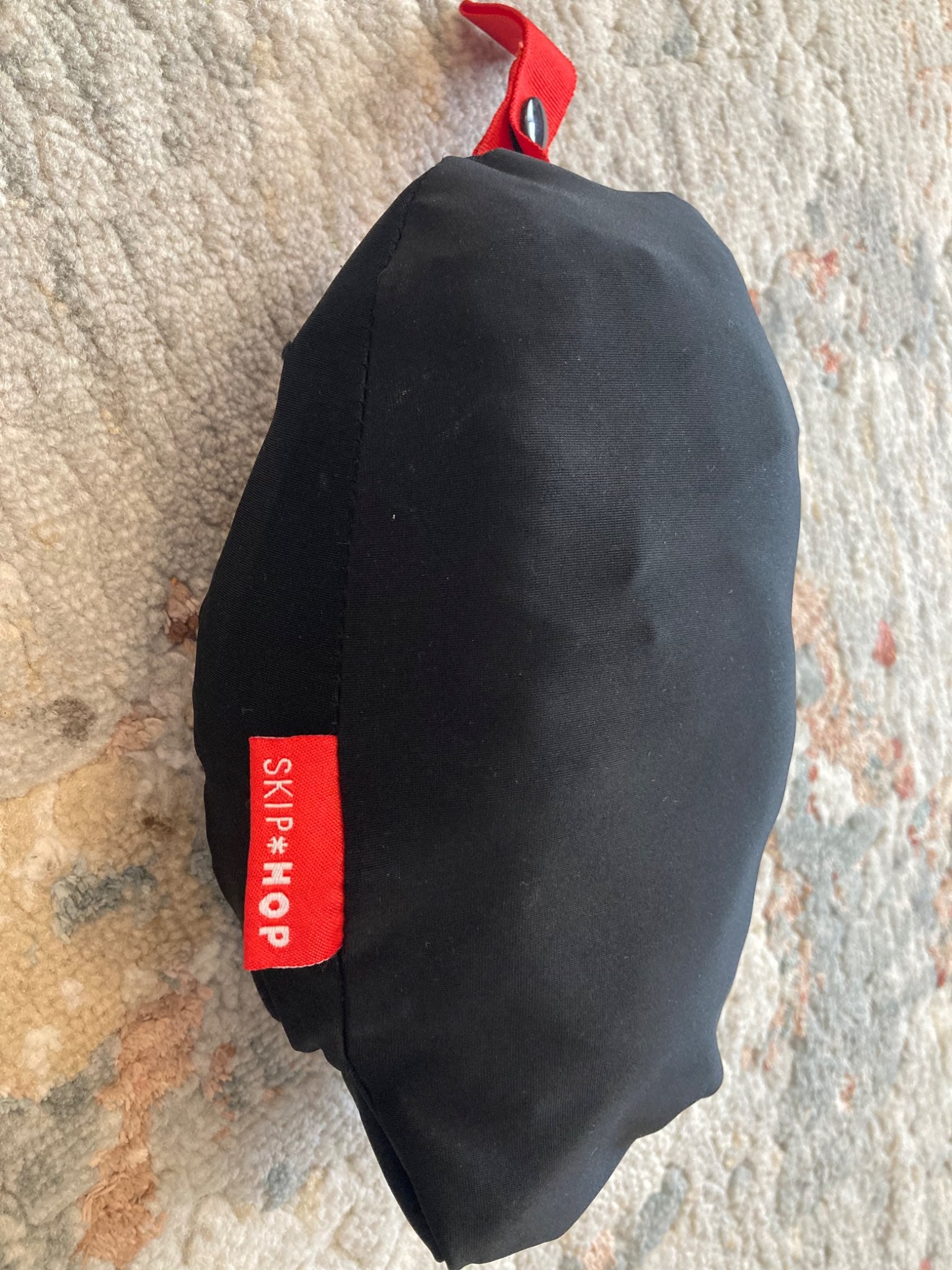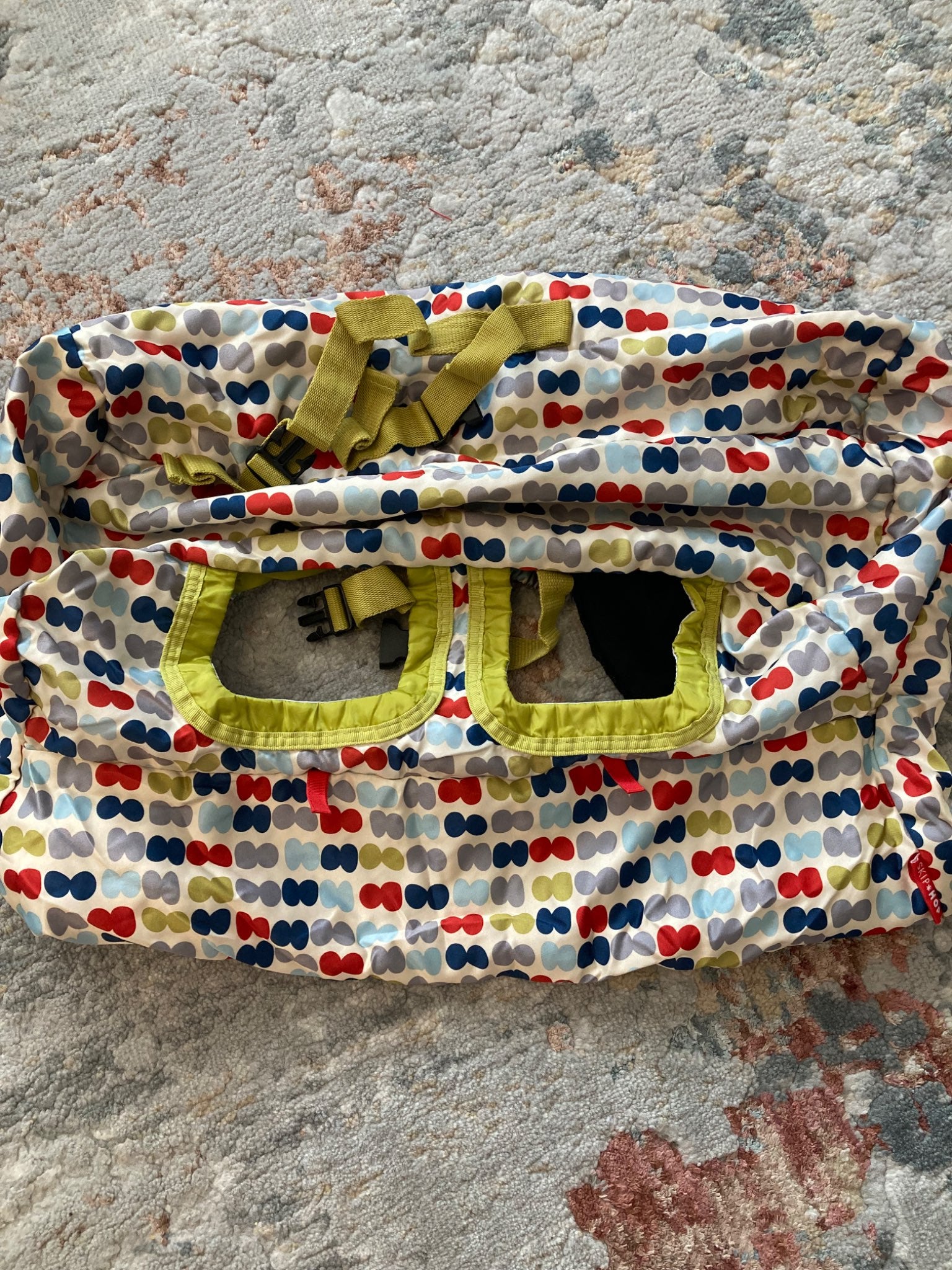 Description : Shopping cart cover fits most standard size shopping carts and restaurant high chairs, loops on front to attach toys, easily packs into built in pouch