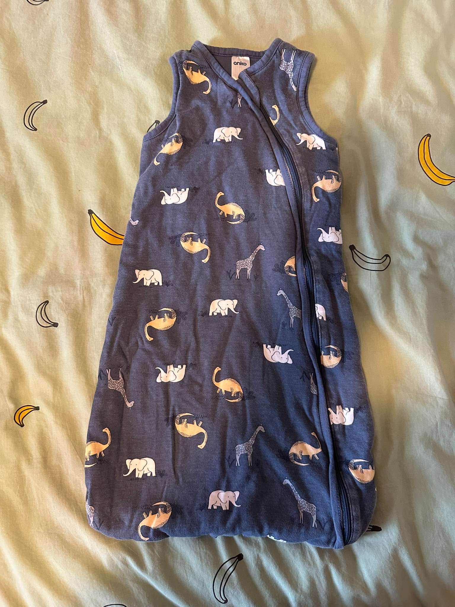 Description : Warm sleep sack - Anko brand Size 3-6 months Sleeveless Dark blue with elephants/giraffes/dinosaurs Doesn't have a weight on the label but probably equivalent to a 2.5/3.0 TOG Used regularly but carefully maintained and in very good used condition From a house that previously had a cat, but no direct contact with any pets