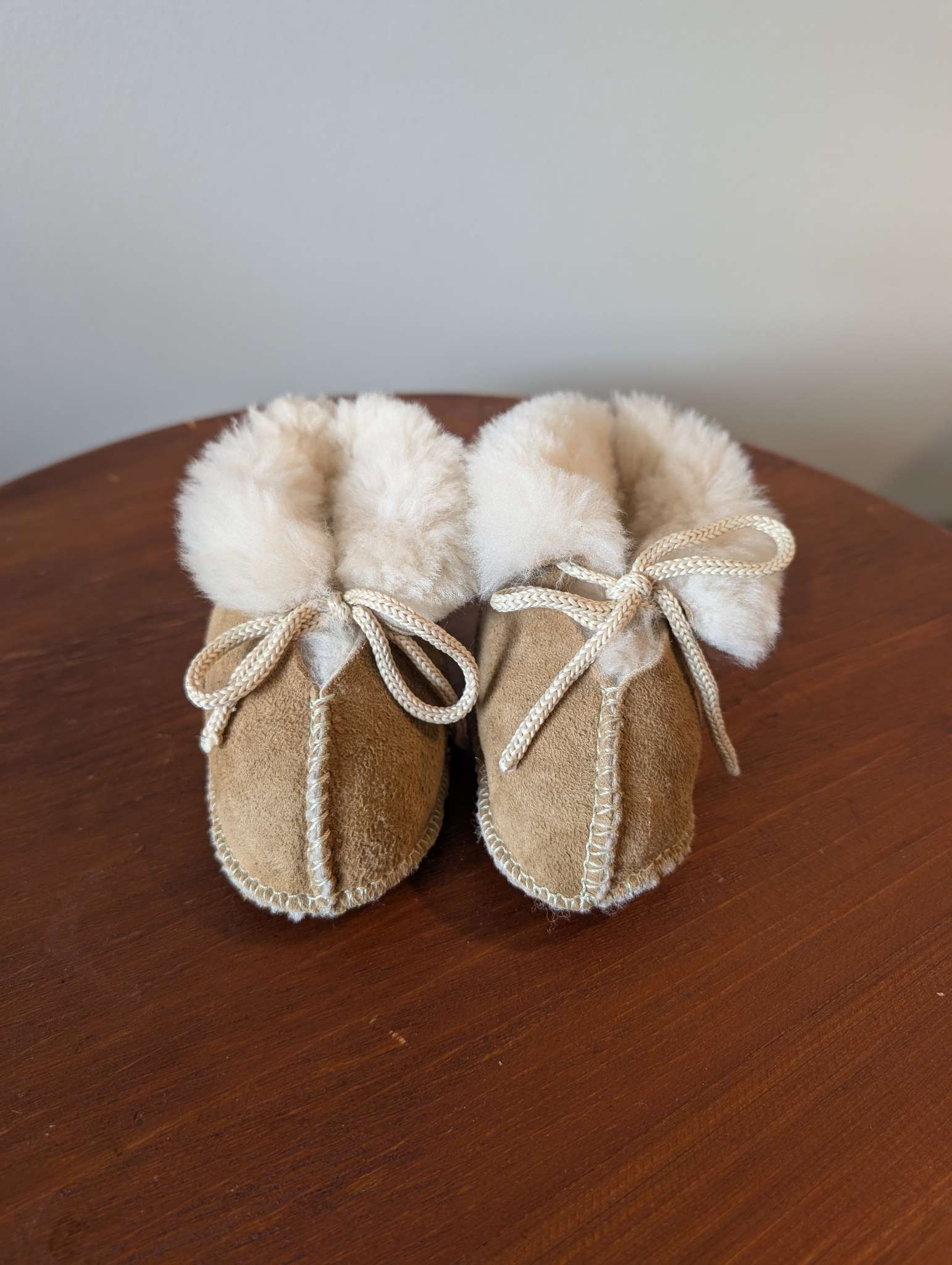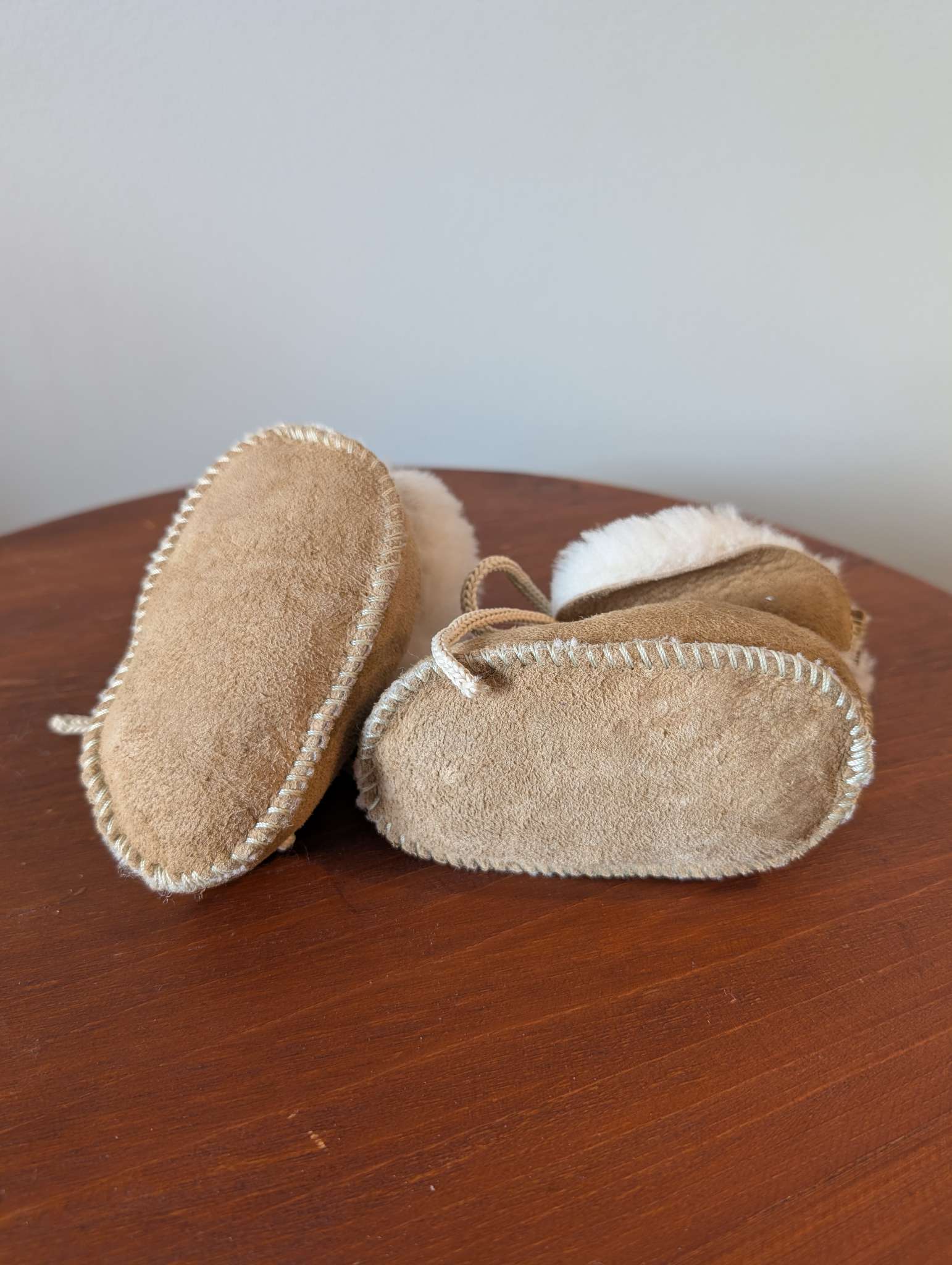 Description : really warm baby slippers. Unsure if they are genuine leather but are buttery soft. Well made but no tags. The lace tightens around baby's ankle to ensure they stay on. Inside is not matted at all.