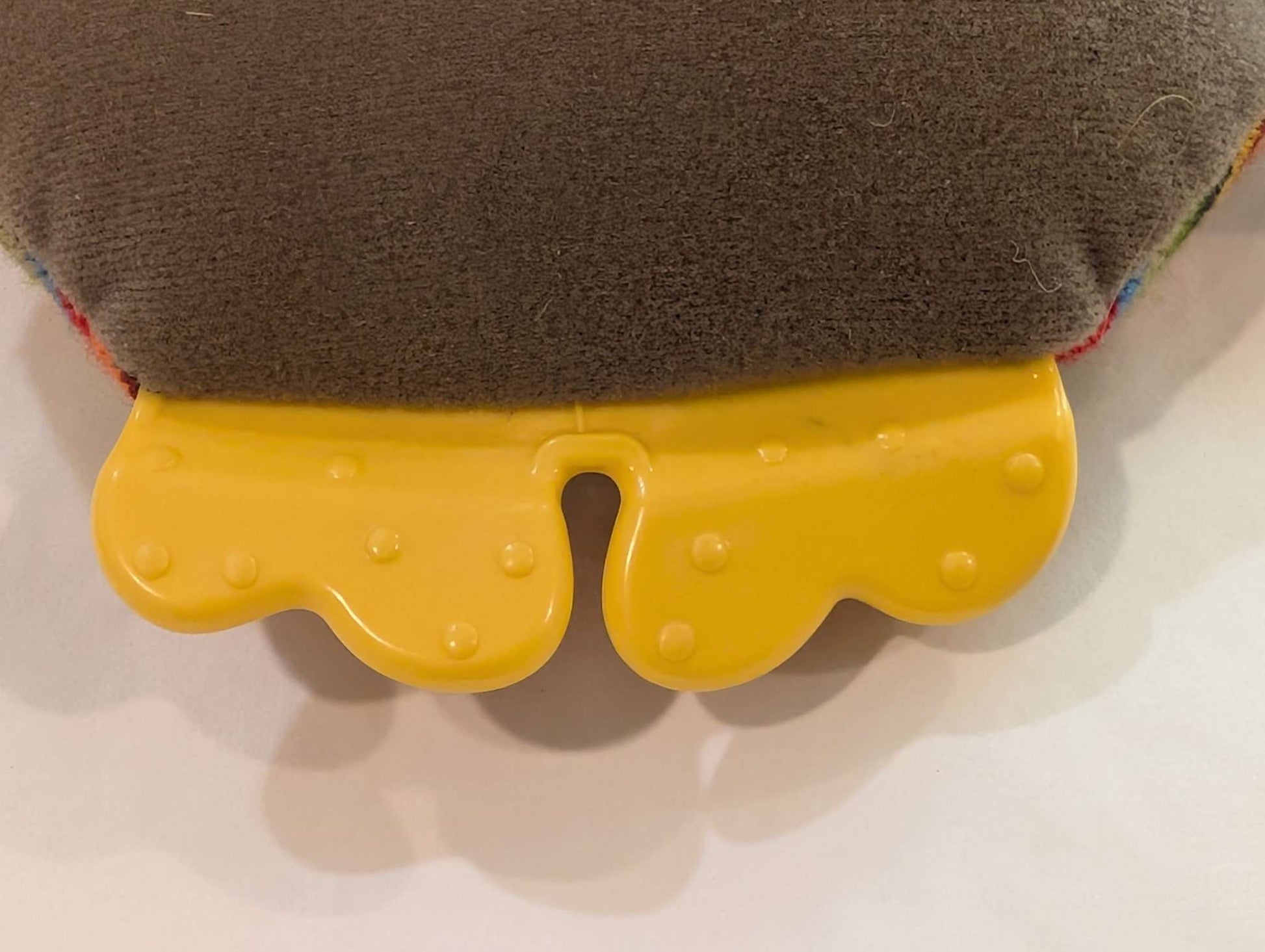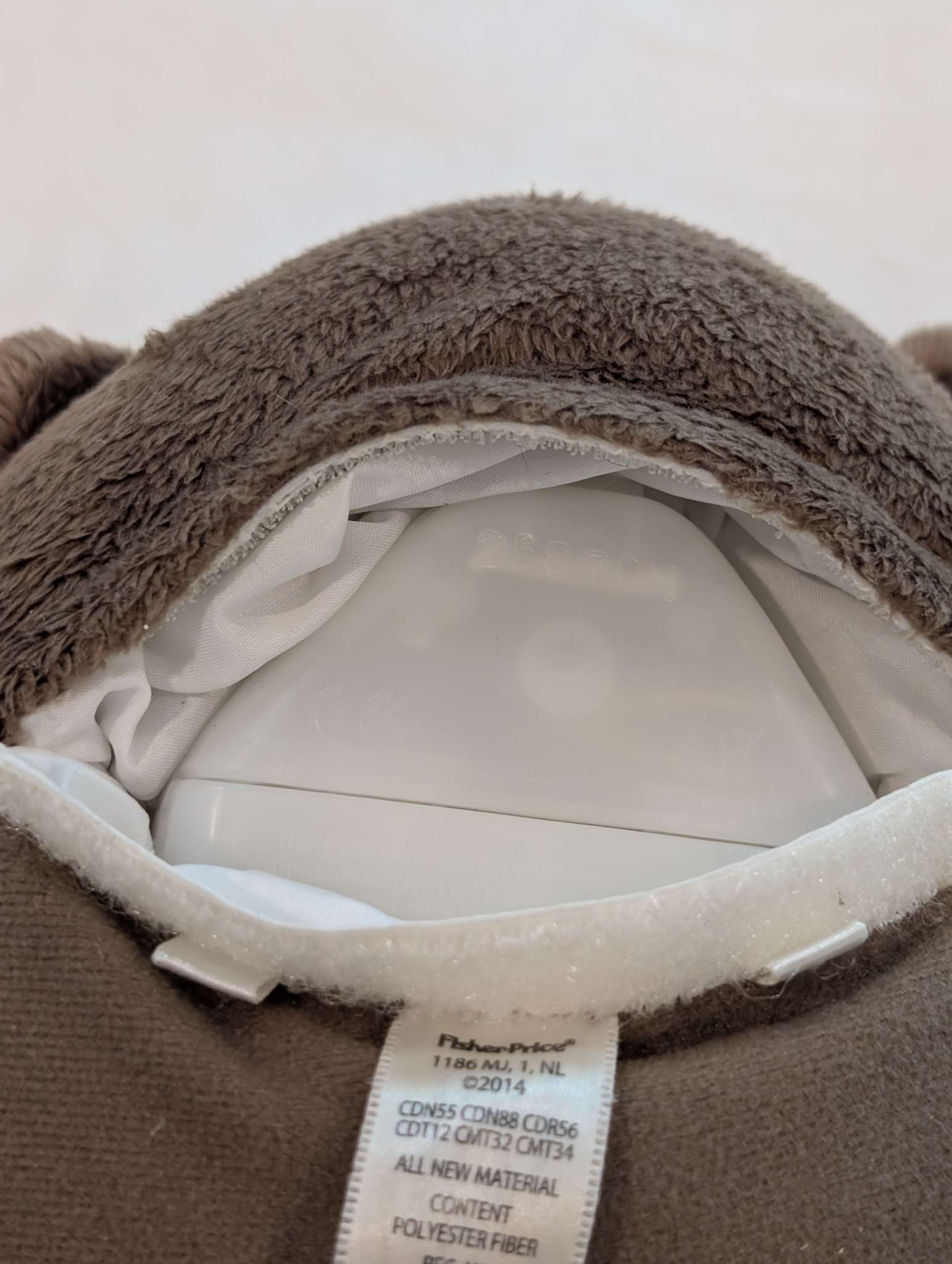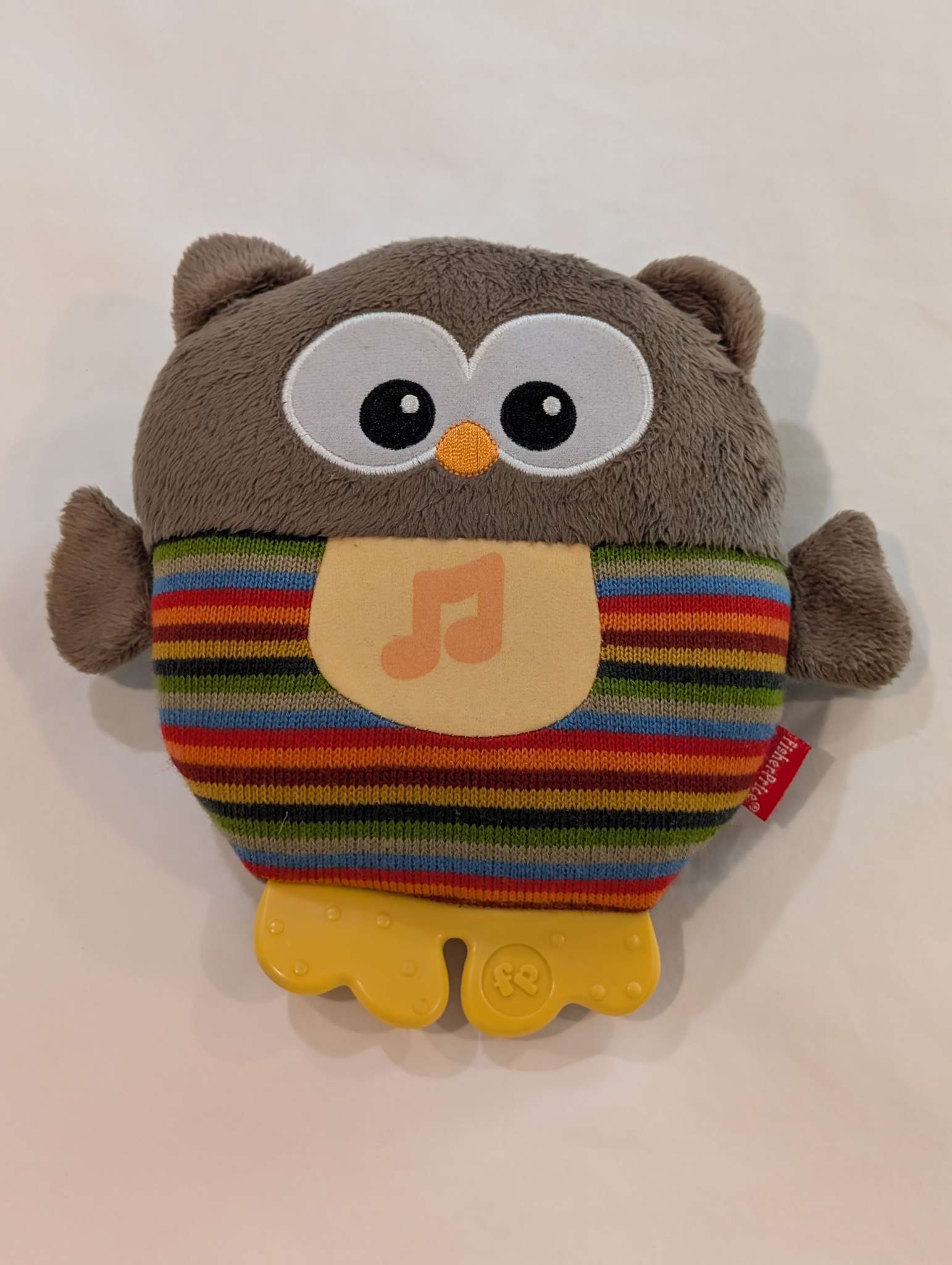 Description : Small marks on feet as seen in pictures, there is a switch inside to turn the music off, switch can be a bit difficult to slide Plays charming hoot-hoot sounds & over 15 minutes of soothing music Soft, cuddly and soothing with a calming, glowing belly Baby activates music & sounds with a gentle squeeze, introducing cause & effect Teeth able feet Soft knits and plush fabrics