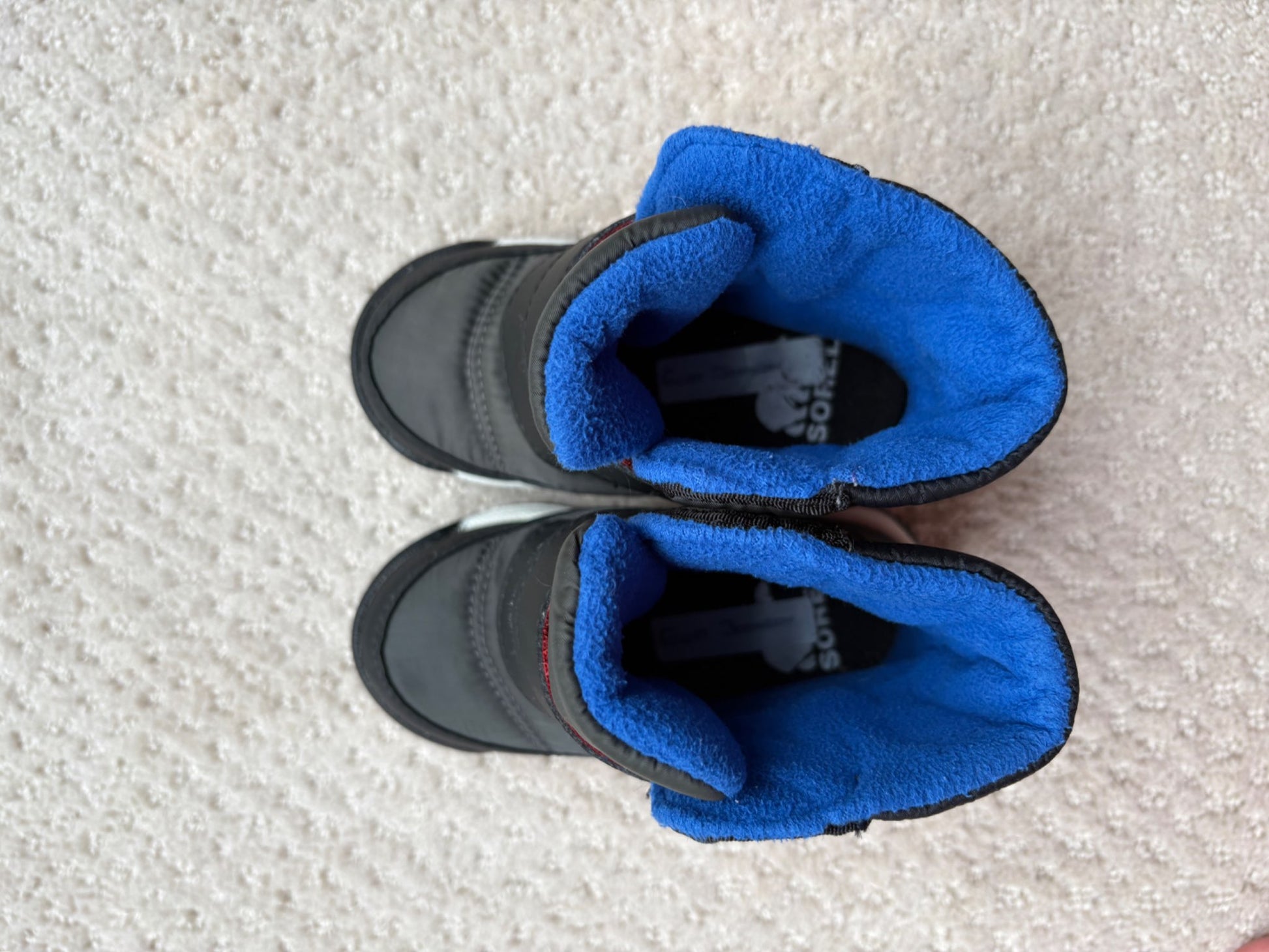 Description : Sorel - winter boots, black with blue, red and yellow accents, Velcro closures, size 6, retail $80