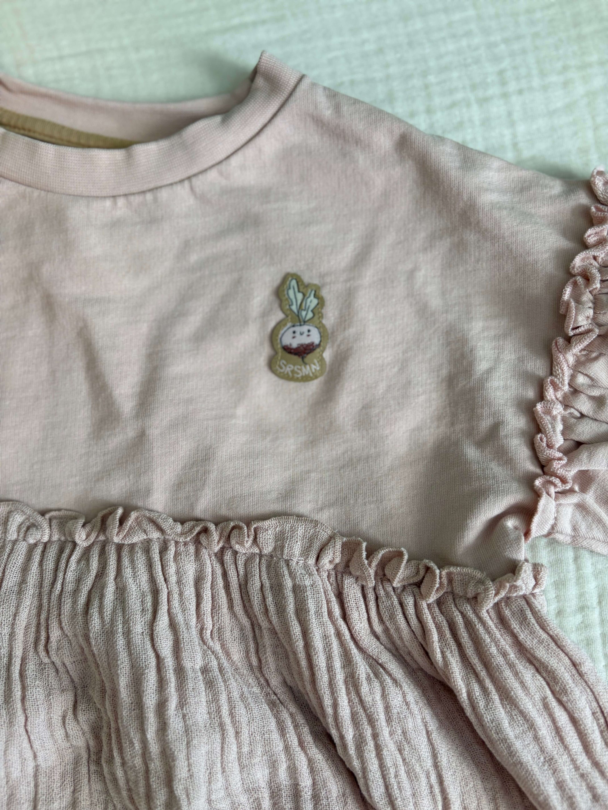 Description: Wide cut pink long sleeved dress with rounded style neck and mini radish illustration on the front. The top part of the dress is made with soft French Terry and the dress component is made of Muslin.