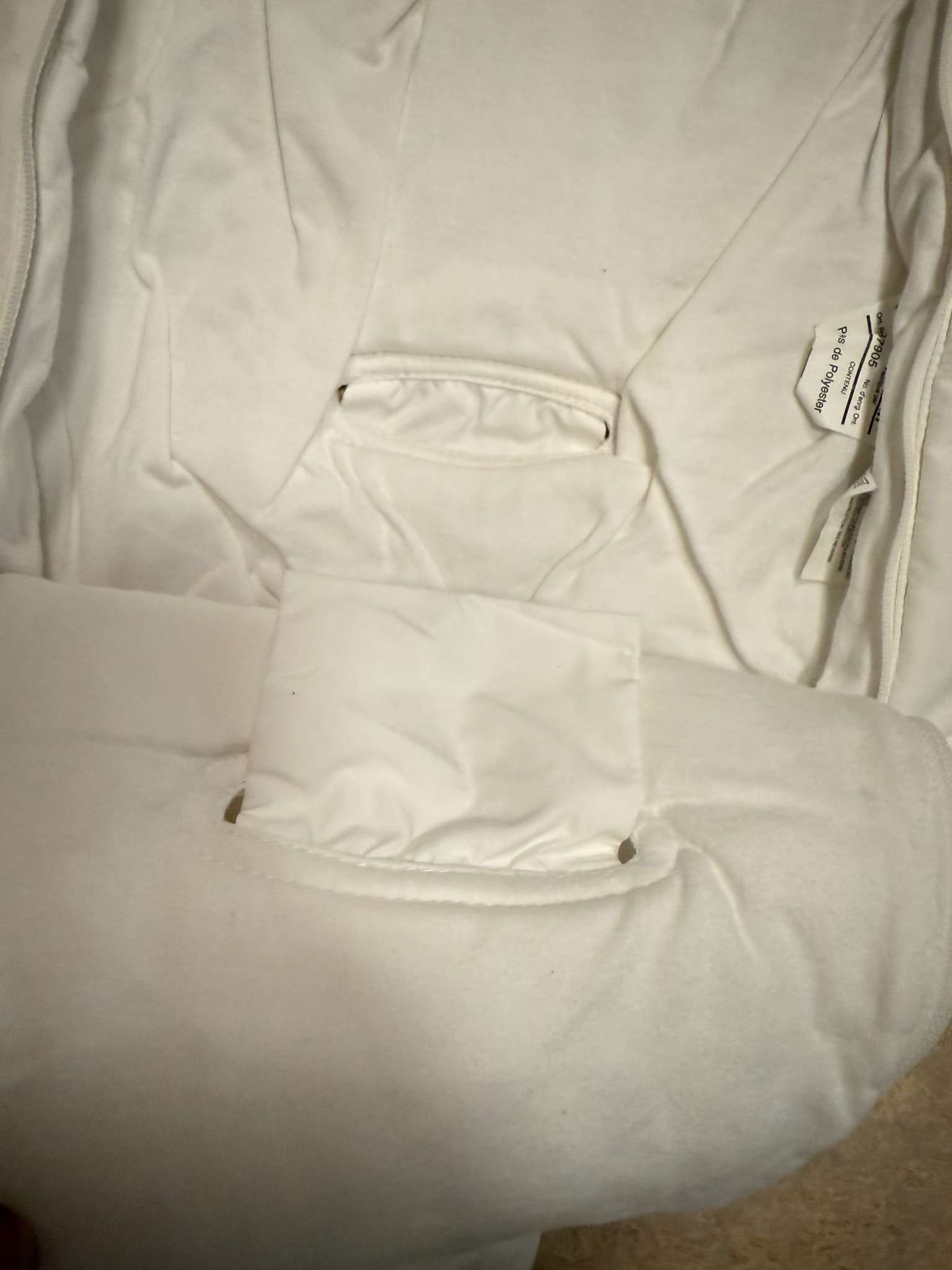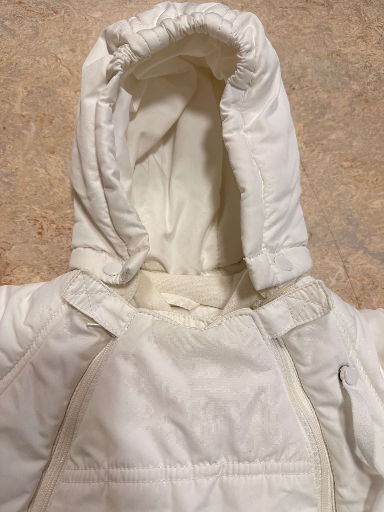 Description : Flannel-lined, padded stroller bunting-style coat, great for winter walks. Hand covers, removable hood, and pass-through spot for a stroller strap.