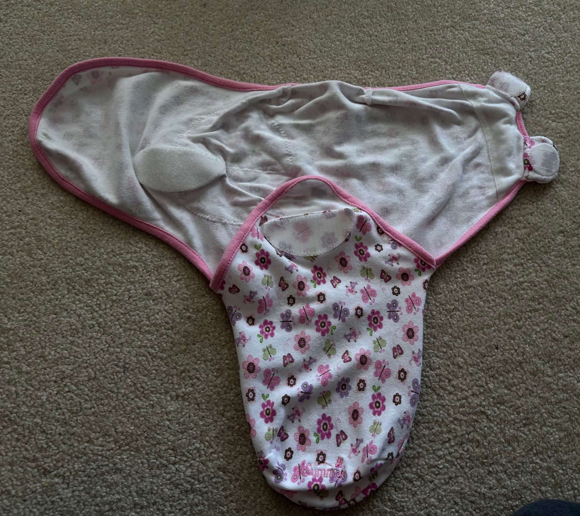 Description : 2 swaddles 0-3 months, sm/med 7-14 lbs 1 pink 1 pink and white with butterflies and flowers