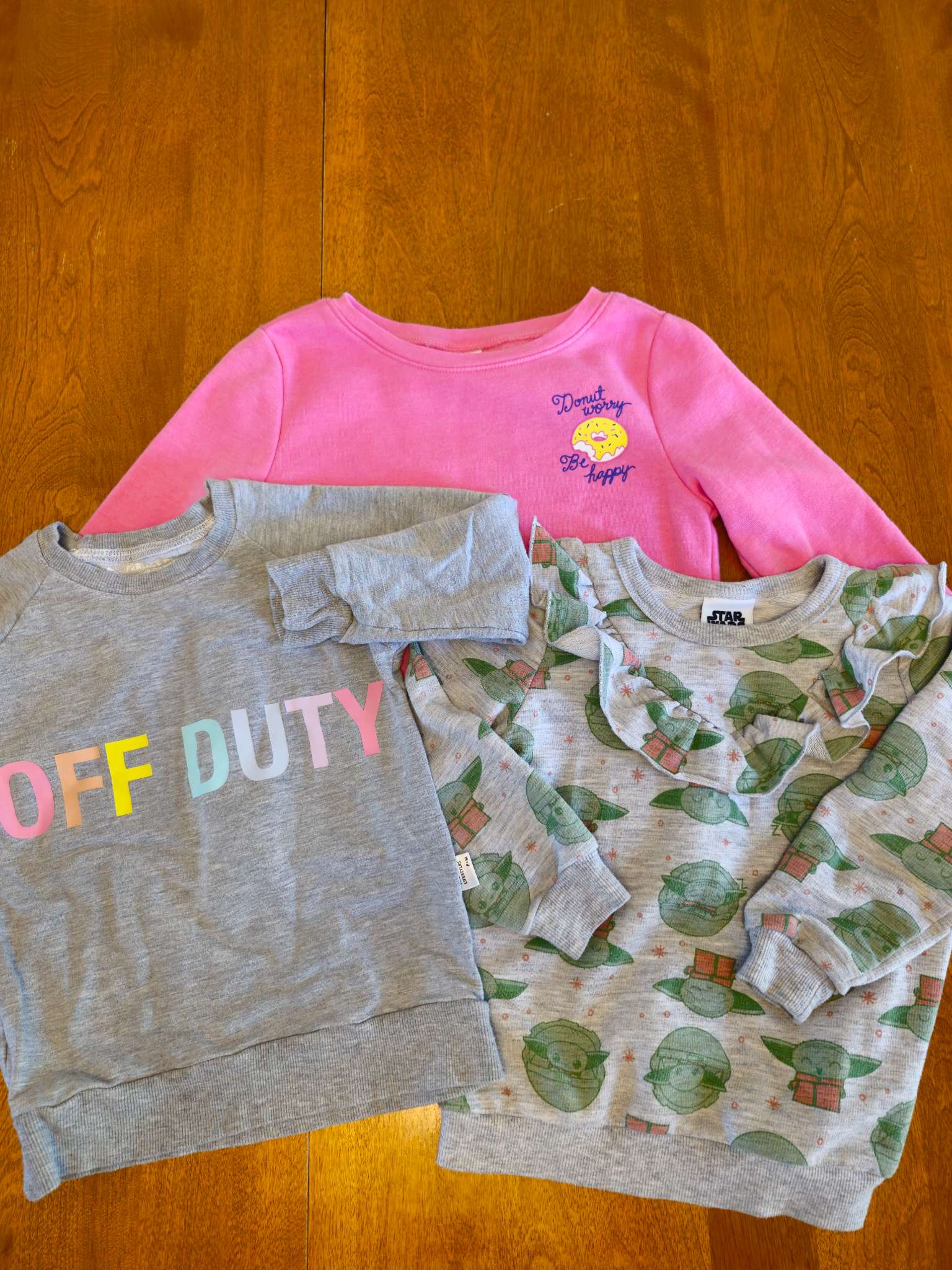 Description : VGUC sweat shirt bundle. Size 4. Pink: Old Navy; "Off Duty": Portage & Main & Yoda print: Star Wars.