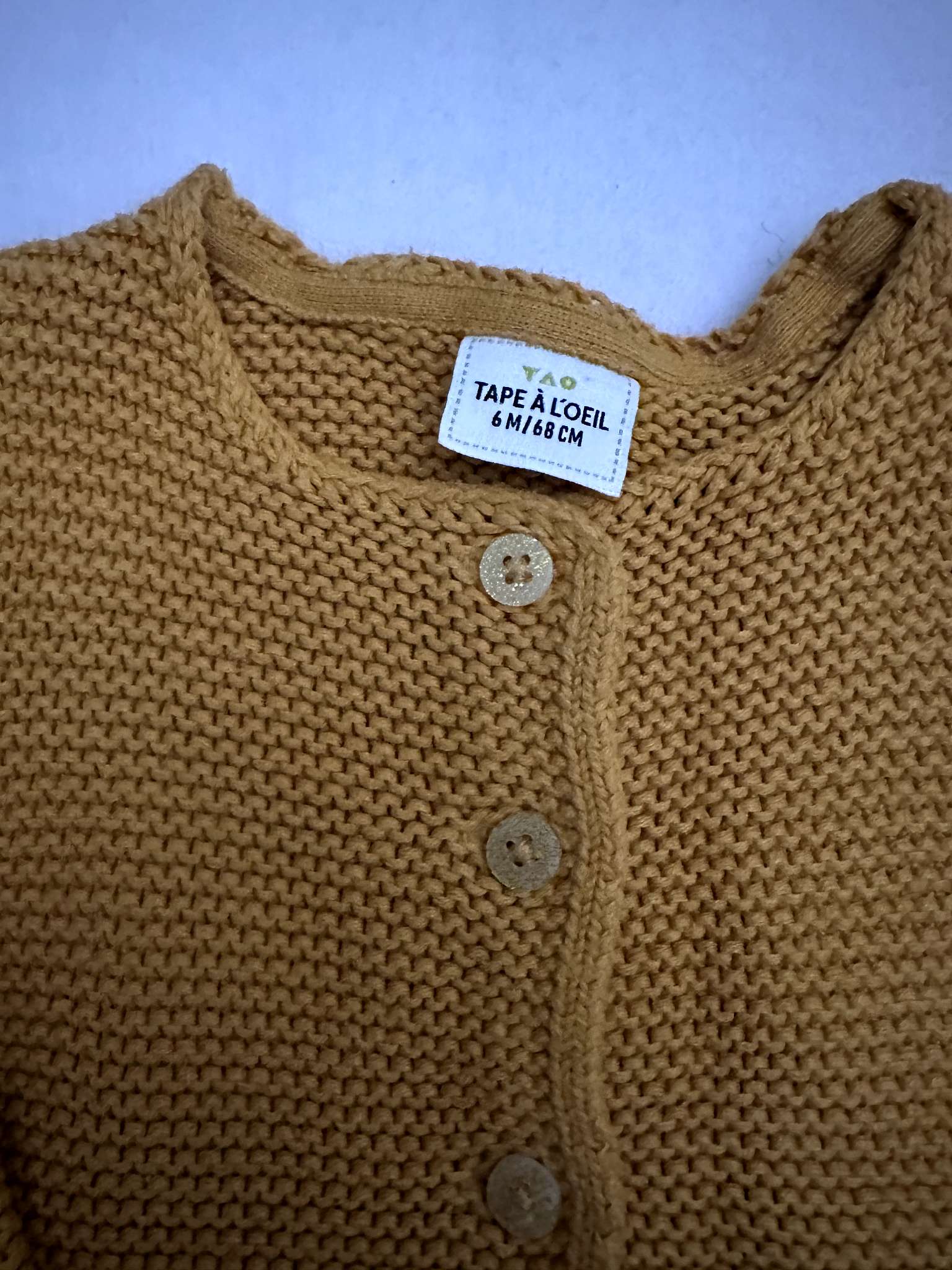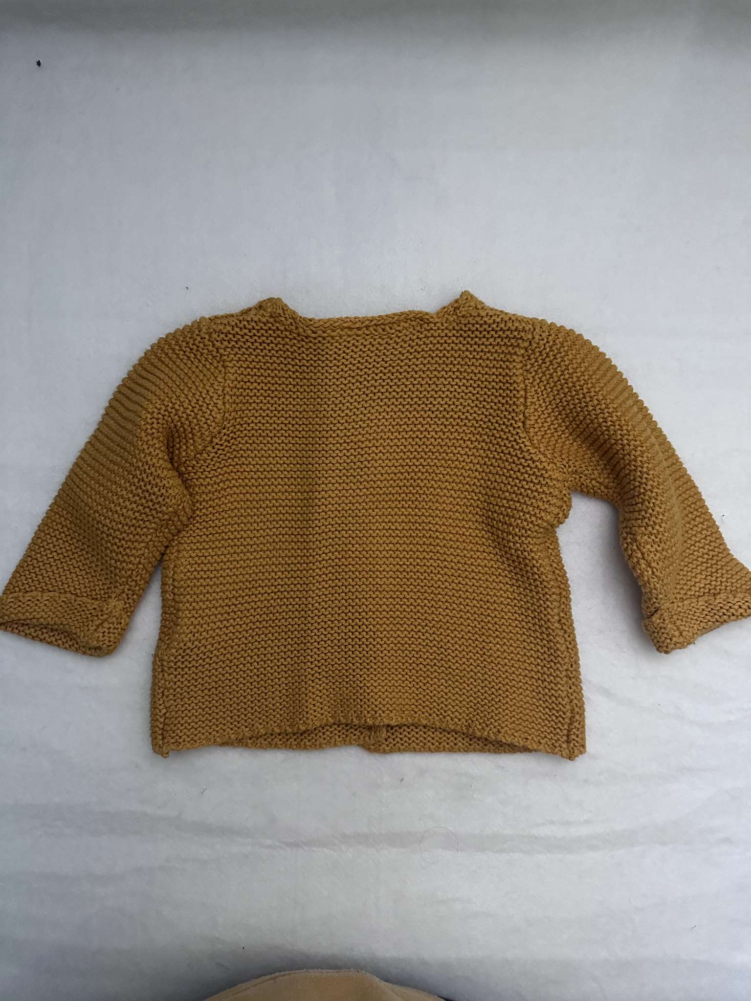 Description : Tape A L'Oeil mustard cardigan with gold glitter buttons 6m (fit much longer); H&M blush eyelet shortalls 6-9m. VGUC. Delicate washed on cold, hung to dry.