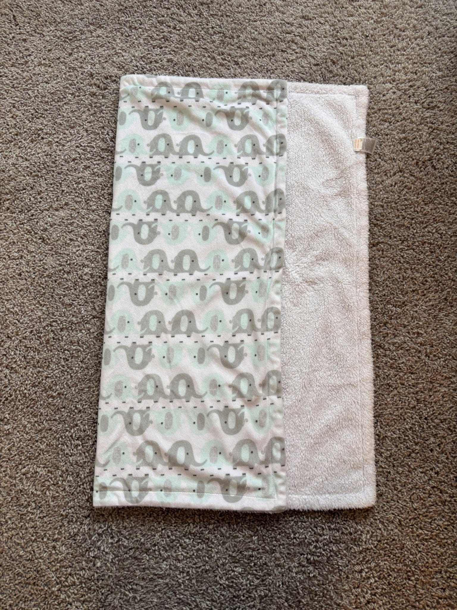 Description : Teal and grey elephant print blanket. Soft minky side and fuzzy white side. Square 30”x30”.