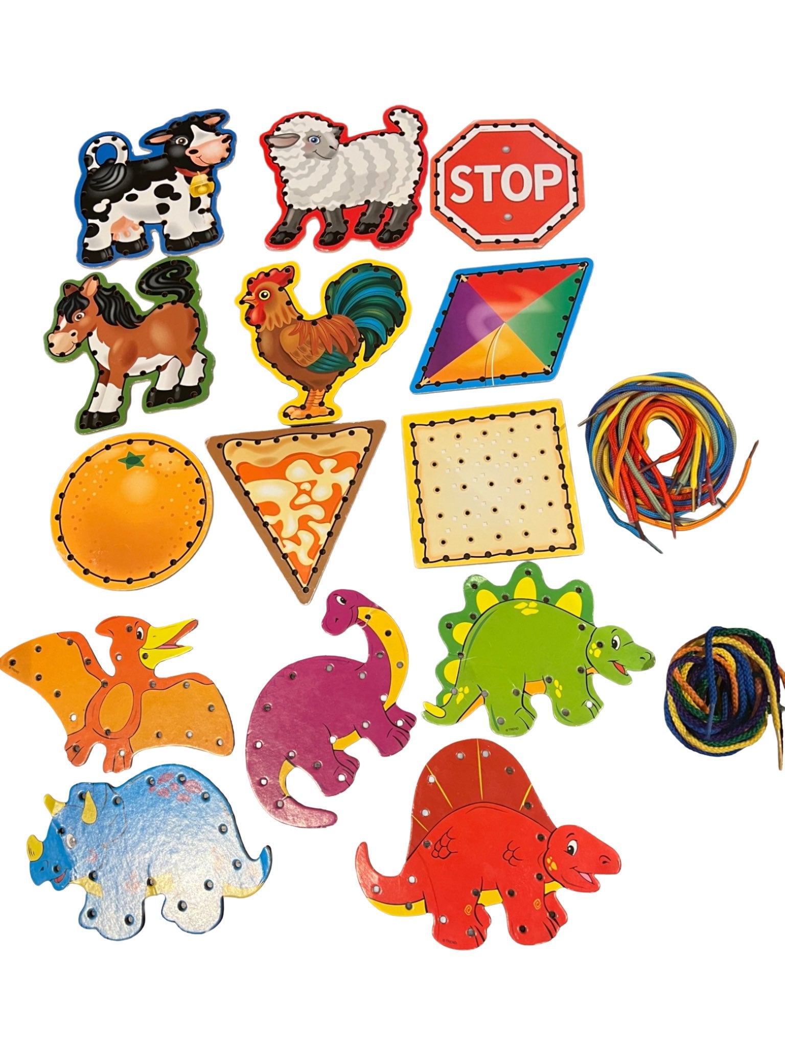Description : Good used condition. 14 all together threading 9 thick cardboard with strings Dinosaur 5 set they are thinner cardboard not as sturdy and have bending in some of the dinosaurs