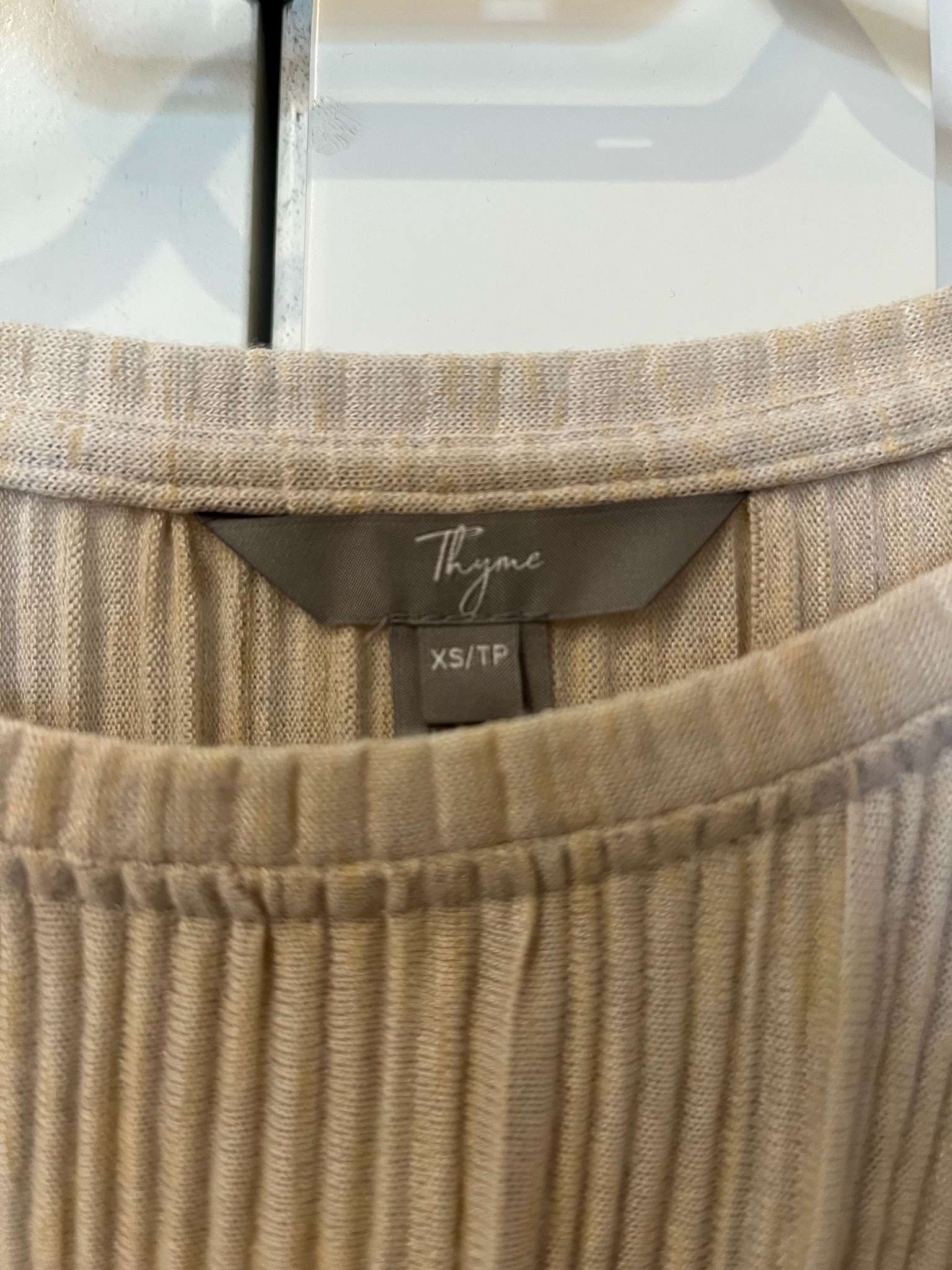 Description : Thyme Maternity Midi Dress - Size XS Flattering Midi-Length Maternity Dress in a beautiful beige fluted material. Size XS but fits generously. Perfect for work or social occasions. Excellent Used Condition.