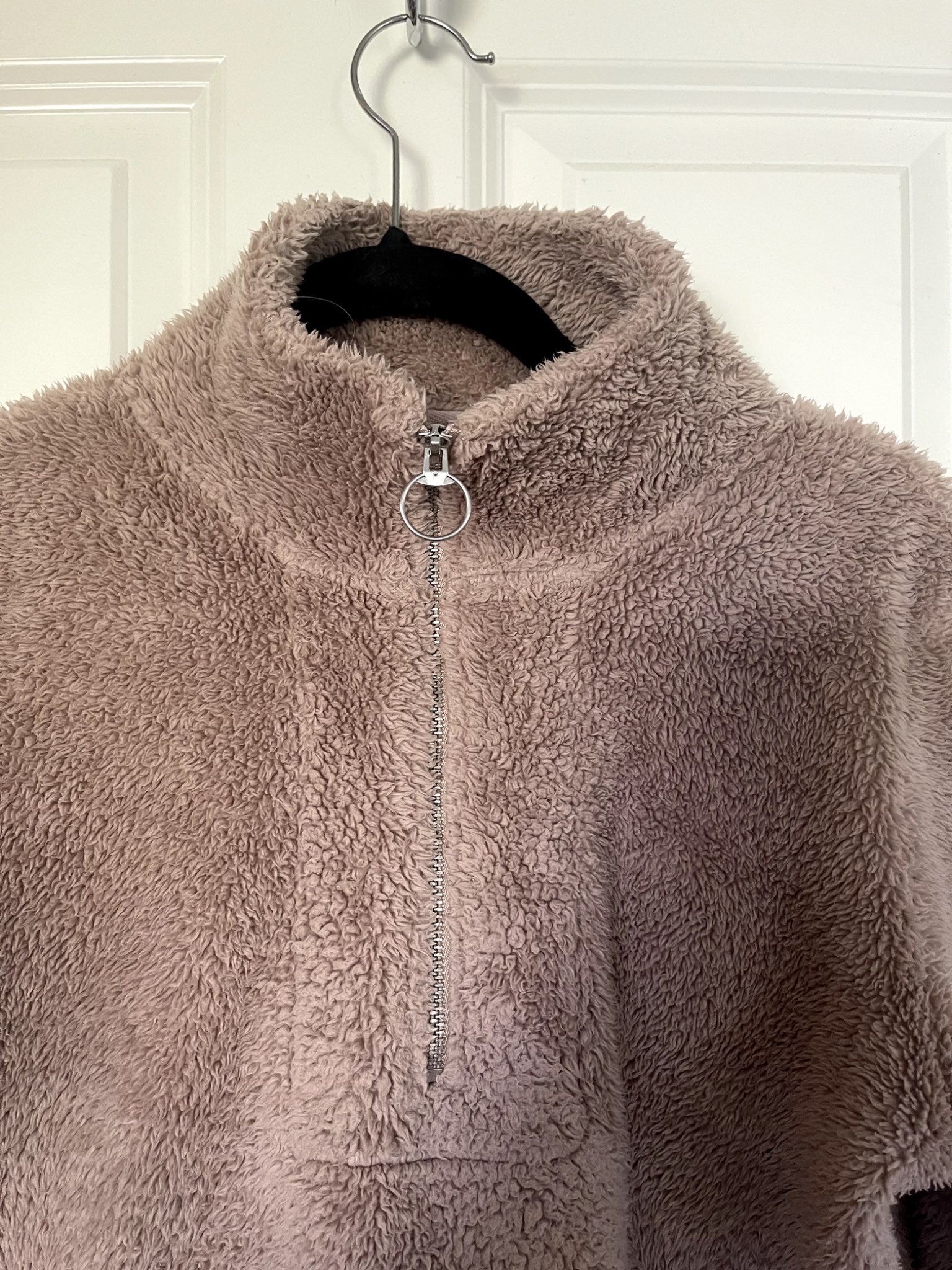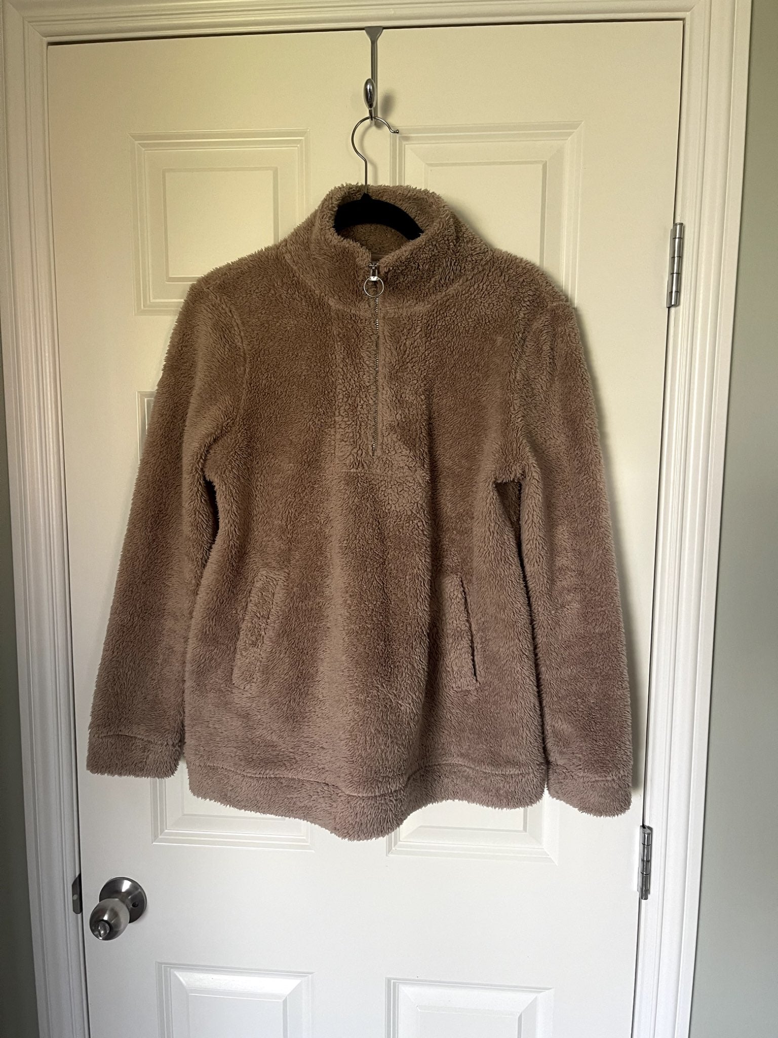 Description : Medium brown 3 quarter zip maternity sweater from Thyme Maternity. Very fuzzy and warm!