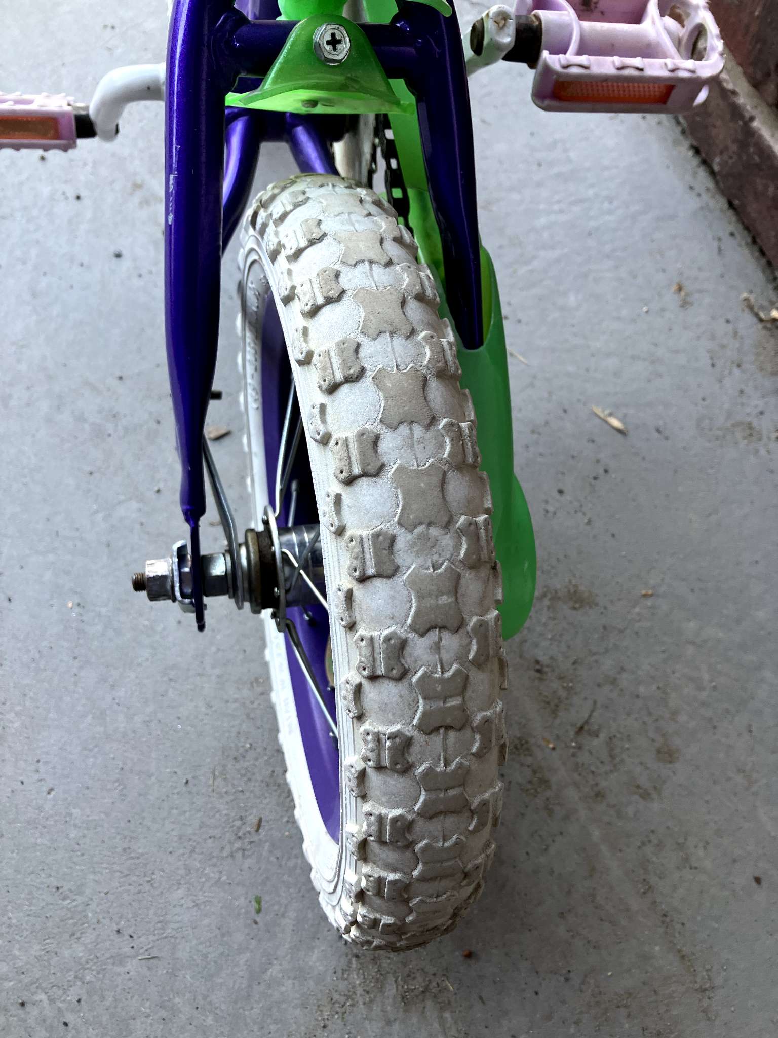 In good working condition and well loved. Please see photos. Some of the plastic accessories have cracked around the chain and the back wheel plastic flower decoration also has a crack. Seat has some marks and we have attached a separate Frozen basket to the front for carrying small treasures but this can easily be taken off (attached with zip ties)