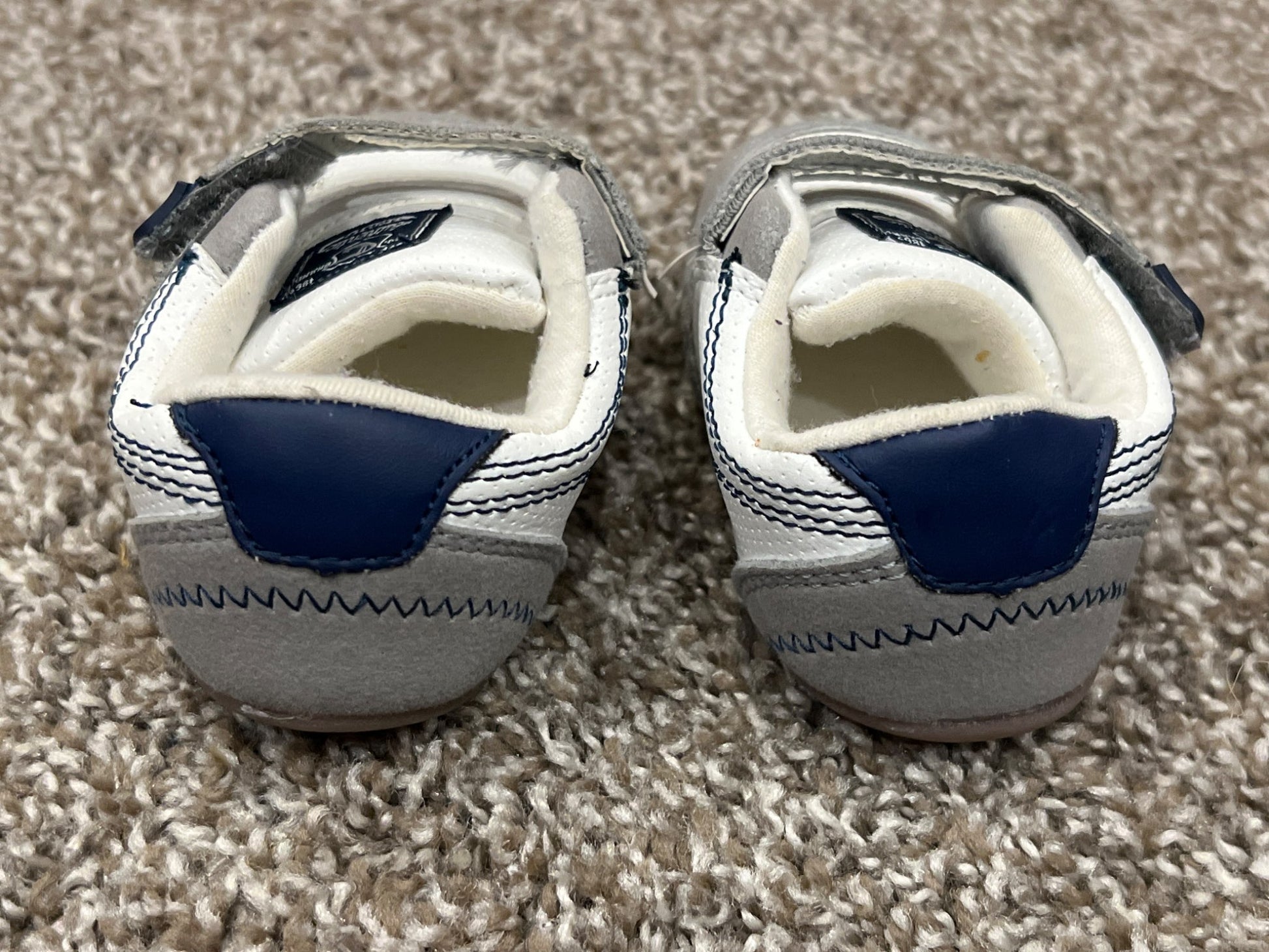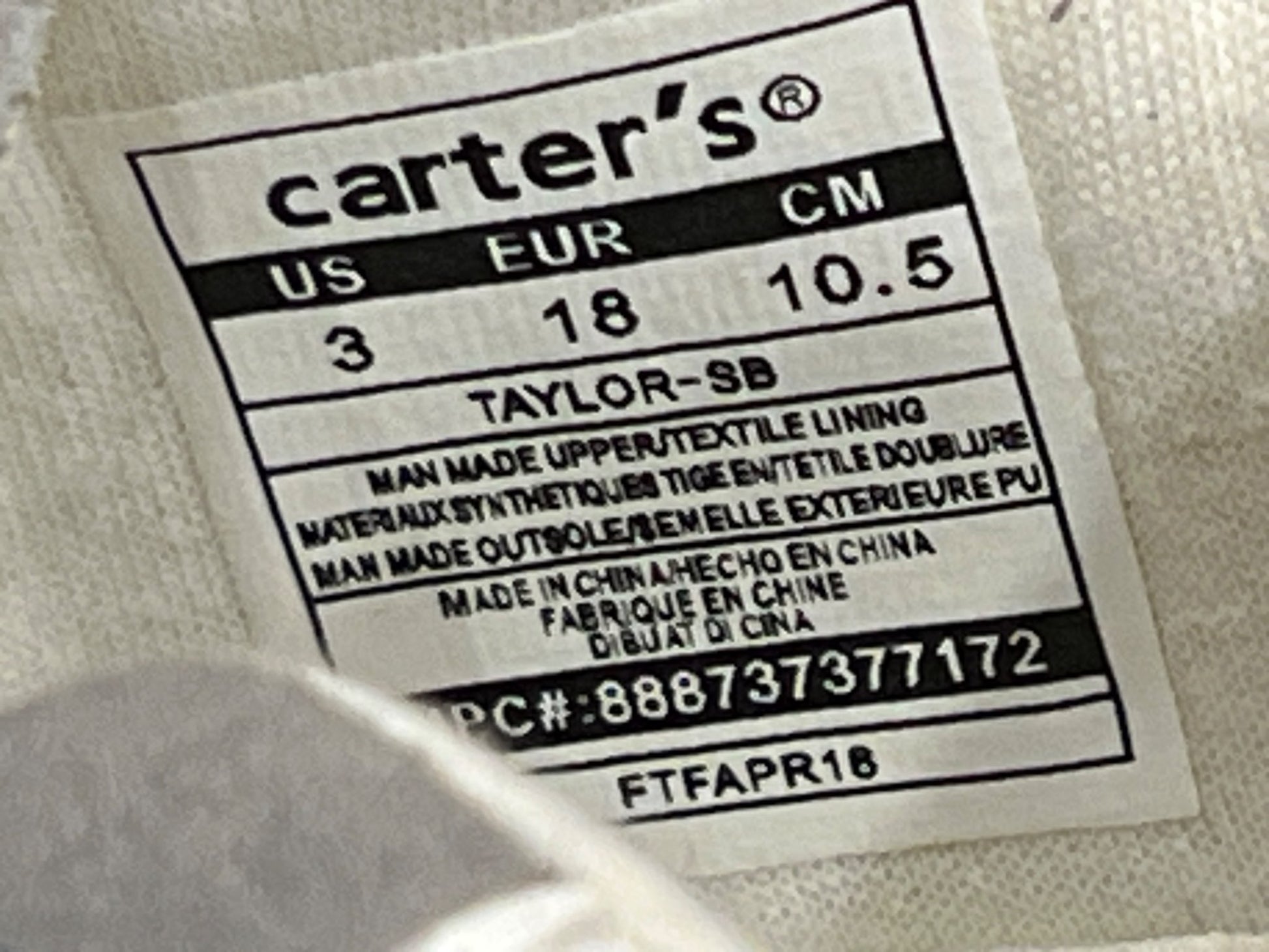 Description : Toddler Boys, Carter’s Velcro Sneakers, size 3, VGUC Right foot, inner side, has minor staining, however cannot be seen when wearing the shoes.